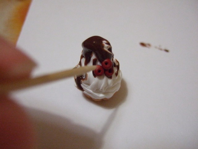 [показать] Основная часть работы готова.Теперь можно украсить корзиночку. Я решила украсить их шоколадом и вишенками. Для получения шоколадной глазури я смешала фимо-гель и кусочек FIMO цвета "шоколад". Полученный шоколадный крем аккуратно наносим на корзиночку с помощью зубочистки.