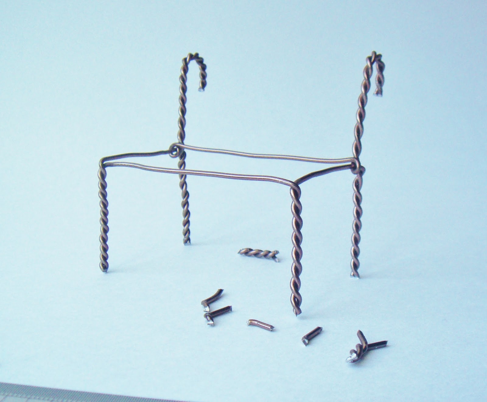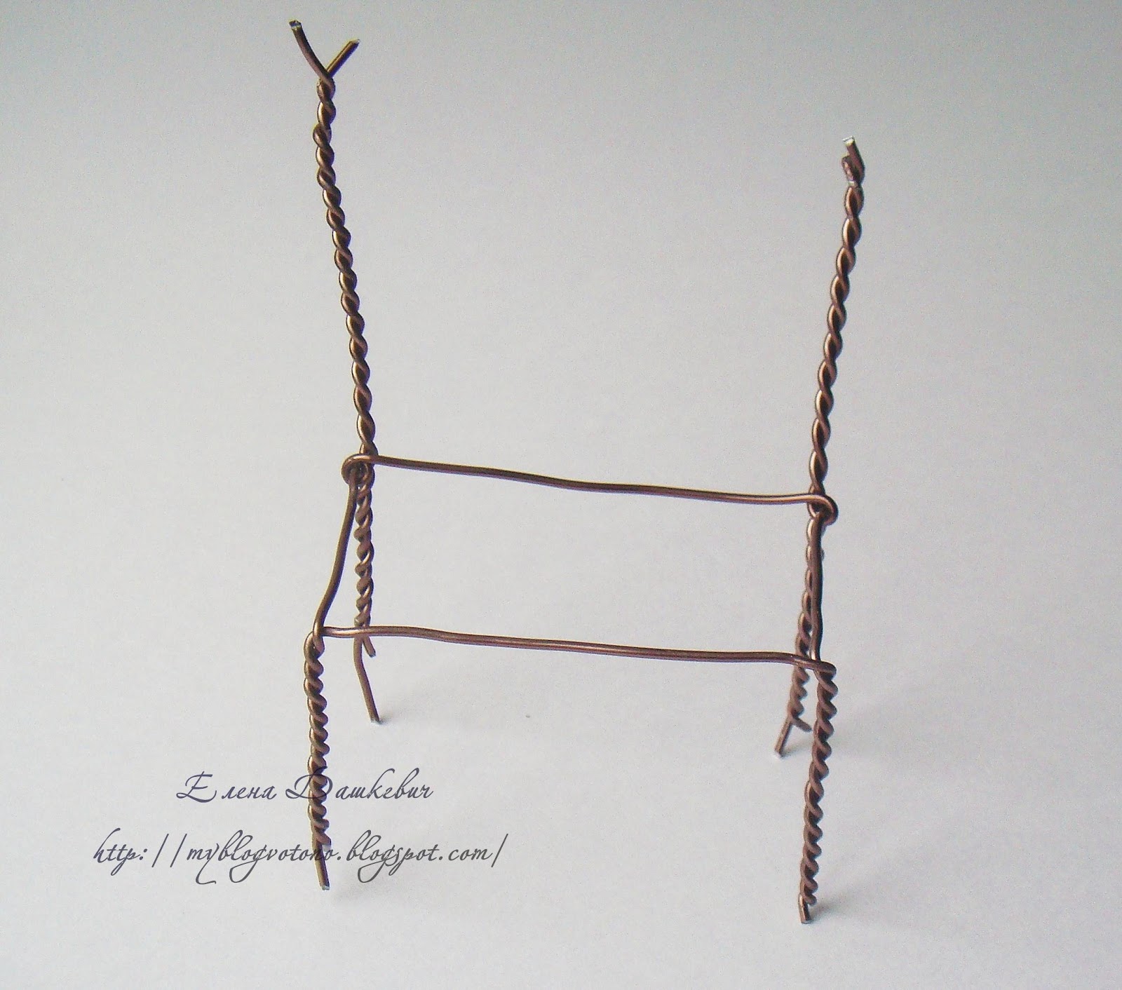 Здесь ширина и длина сиденья (у меня 3,5 и 7см), руками или плоскогубцами загибаем проволоку вниз, это еще 2 наши ножки. Длину делаю чуть больше, чтобы потом выровнить при помощи линейки.
