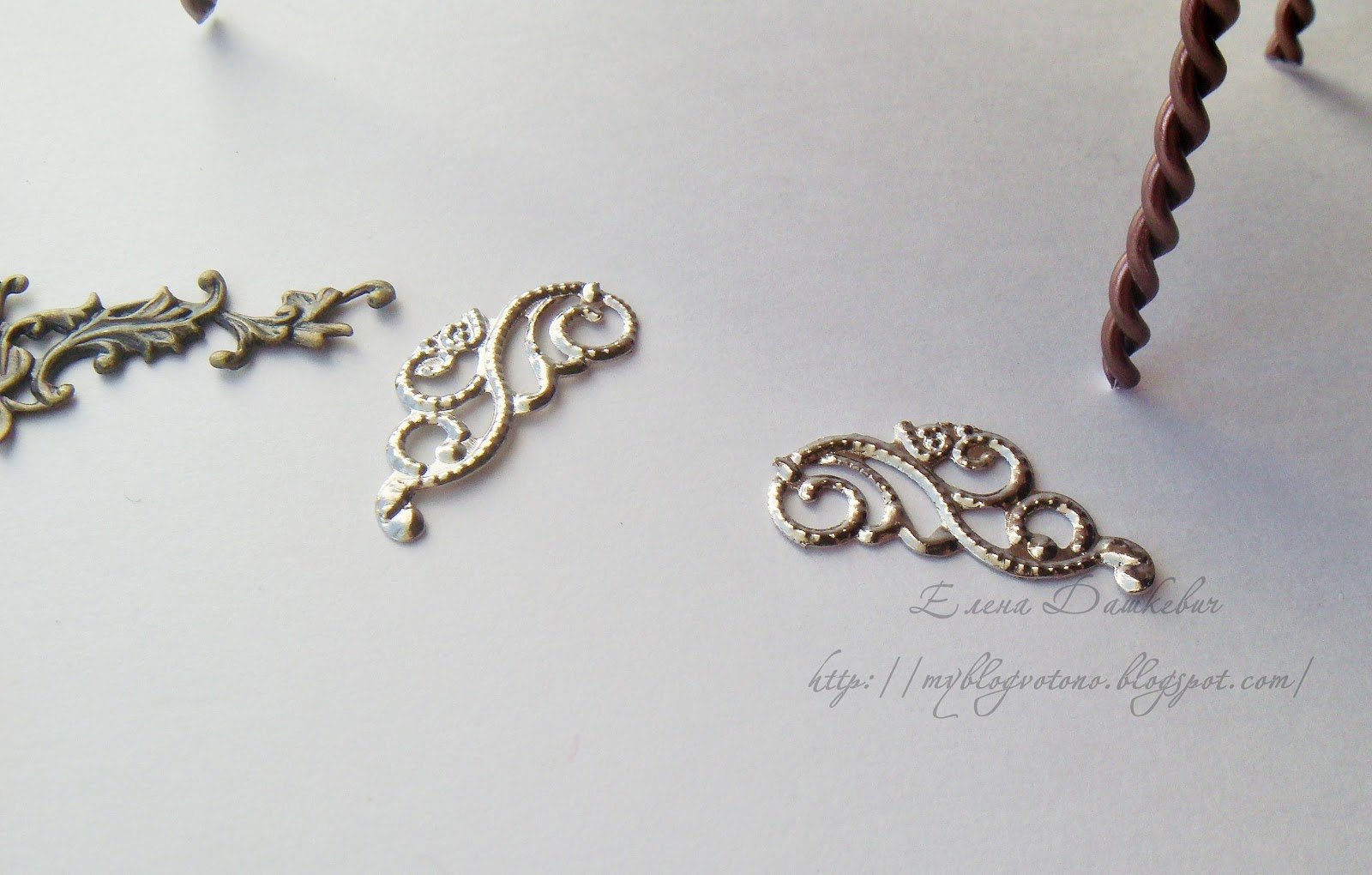 Уголочек цвета латуни - более жесткий, его не разрежешь (производителя не знаю)), а вот уголки из английского магазина "Дикая орхидея" очень легко разрезать с помощью ножниц - из них я вырезала 2 таких маленьких детальки для украшения: