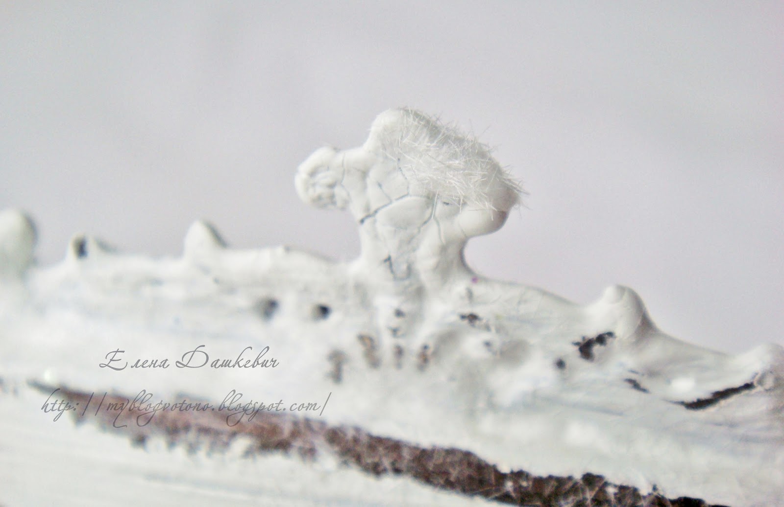 Я покрасила свою скамеечку сначала коричневой краской и местами натерла свечкой. Потом покрыла двумя слоями белой акриловой краски и потерла наждачной бумагой, чтобы получить эффект потертости. Добавила немного белого кракелюра и "посыпала снежком" - смешала бархатную пудру с небольшим количеством хрустального глиттера и приклеила его с помощью клея ПВА.