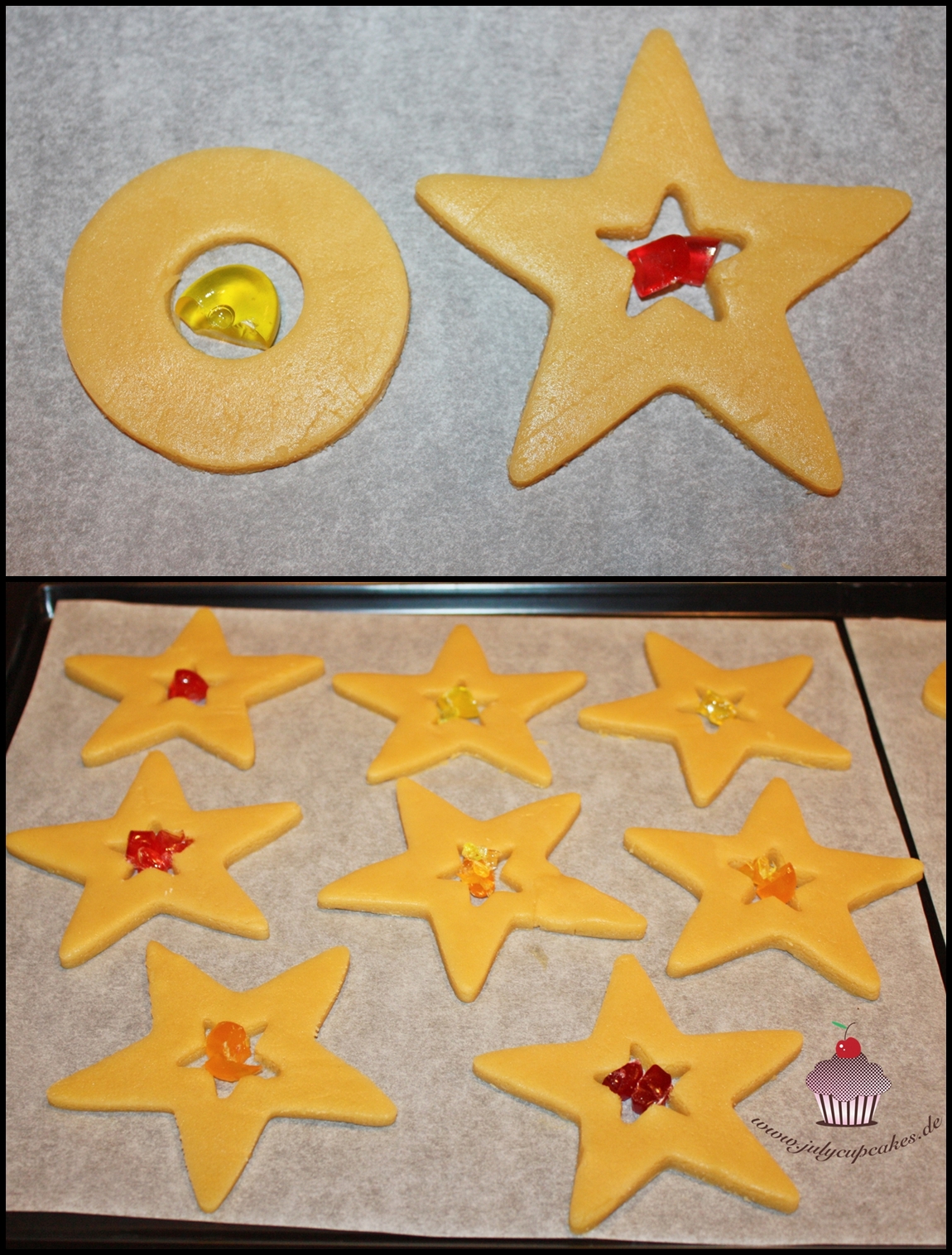 Хорошо примороженные печенюшки-звёзды аккуратно снимаем и укладываем на подготовленный лист для выпечки. Леденцы-крошку кладём в отверстие, леденцы не должны касаться теста, иначе будут некрасивые разводы на самом печенье.