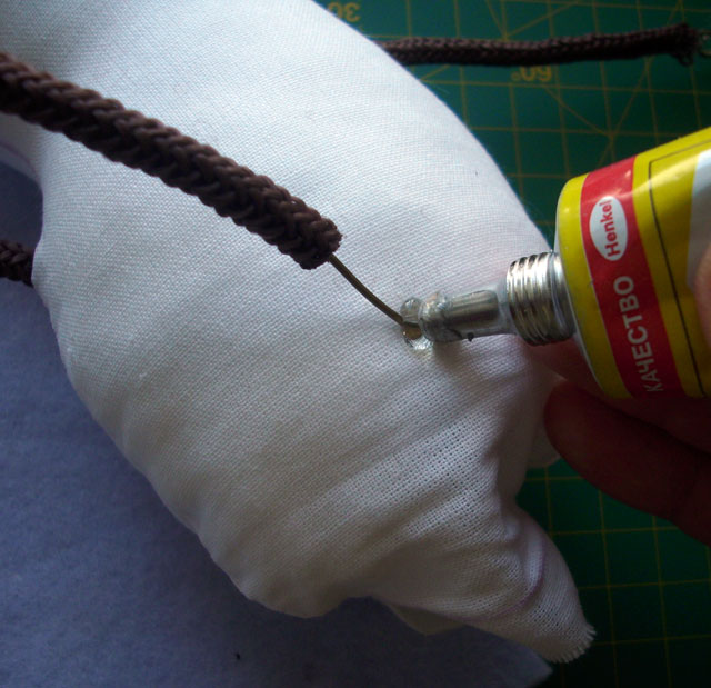 После этого аккуратно приклеиваем шнурок к тушке клеем Момент-Гель.