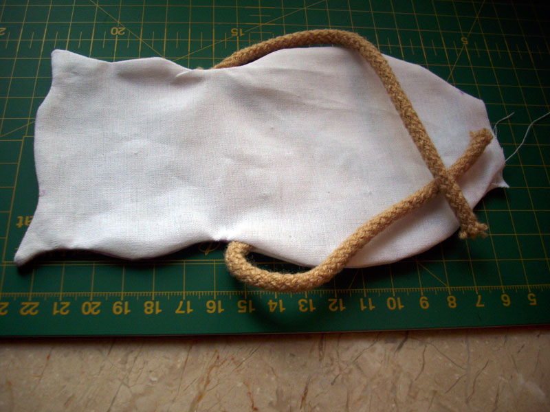 Отмеряем шнурок для ног. Кстати, синтетического, за счет его «тянучести», нужно было брать чуть меньше. Лучше потом немного натянуть шнурок. Я же взяла синтетического шнурка столько же, сколько и х/б, в результате мой синтетический шнурок очень некрасиво перекручивается на лапе кота, как колготки плохого качества на женской ножке. Дальше на фотографиях будет виден этот дефект. Надо будет подумать, как его устранить.