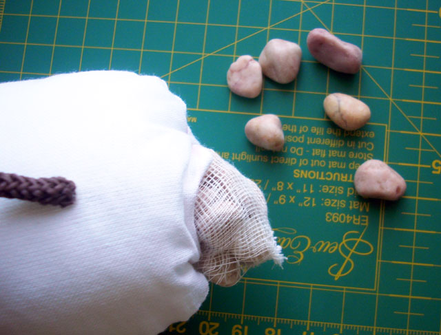 Теперь приготовим утяжеление. В небольшой мешочек из сложенного вдвое бинта я положила мелкие камешки, и затолкала этот мешочек в низ тушки:
