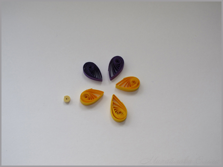 Чтобы сделать цветок фиалки, нам потребуется 2 элемента "капля" фиолетового цвета (если забыли как делать, можно подсмотреть), 3 элемента "капля" желтого цвета и одна тугая спираль. Я использовала полоски длиной 15 см, на одну "каплю" - одна целая полоска. Для серединки, она же тугая спираль или ролл, берем четверть полоски, причем вдоль по всей длине разрезаем пополам, чтобы ширина была не 3 мм, а 1,5 мм. В итоге на один цветок у нас будут заготовлены следующие части: