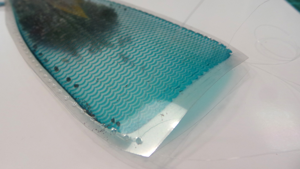 Берем понравившуюся распечатку бутылки и кусочек прозрачной пленки. Не вырезая, пришиваем их друг к другу.