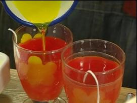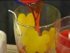 7. И наконец выльем в формочки сначала весь красный парафин а сверху остаток того, из которого делали фигурки
