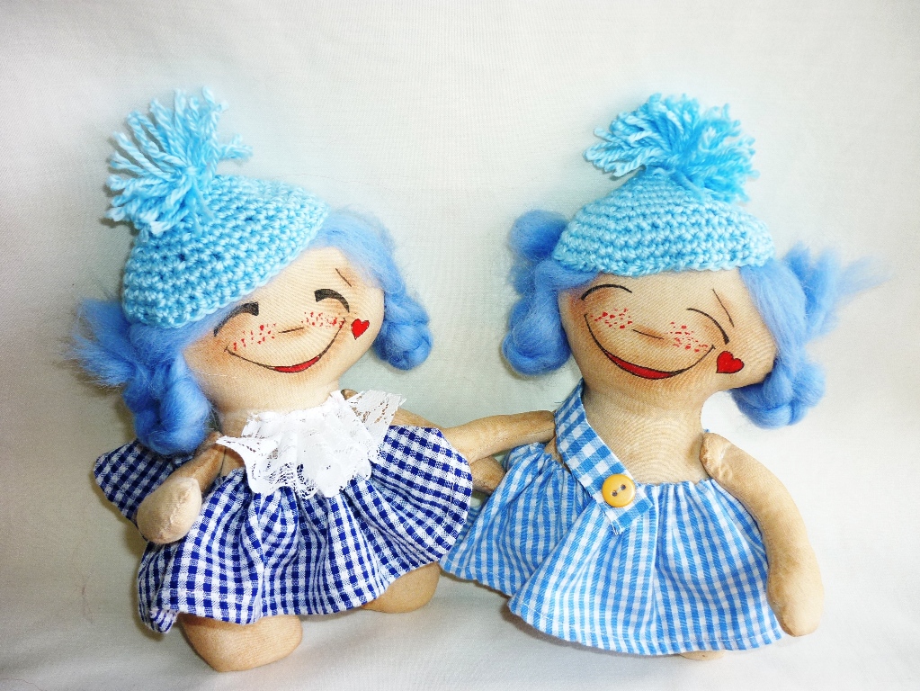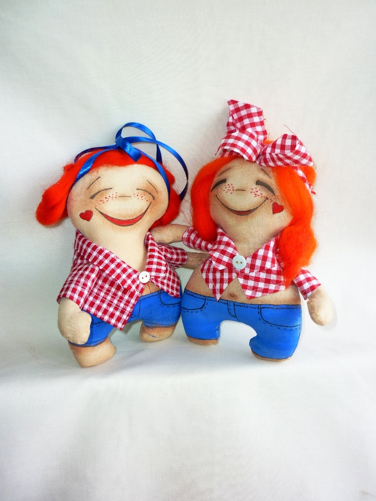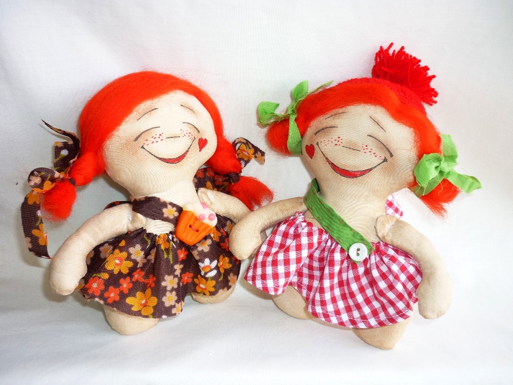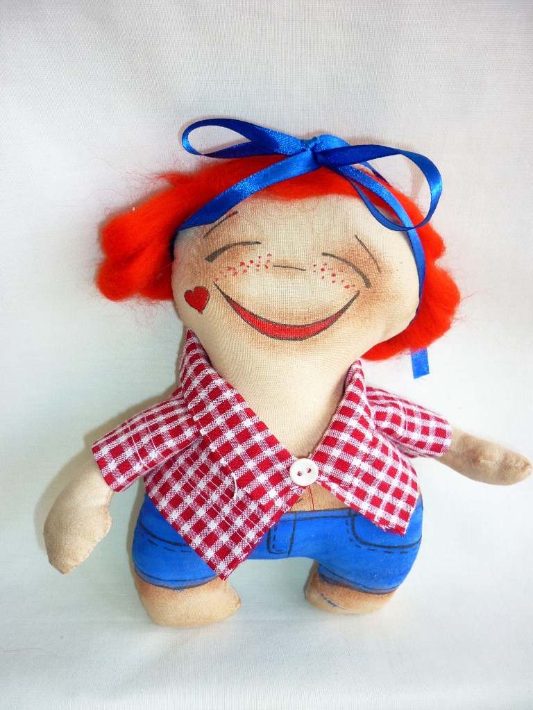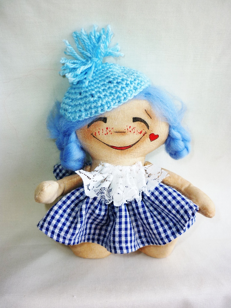 18 см. Бязь, синтепух. Тонированы кофе-корица. Волосы шерсть.