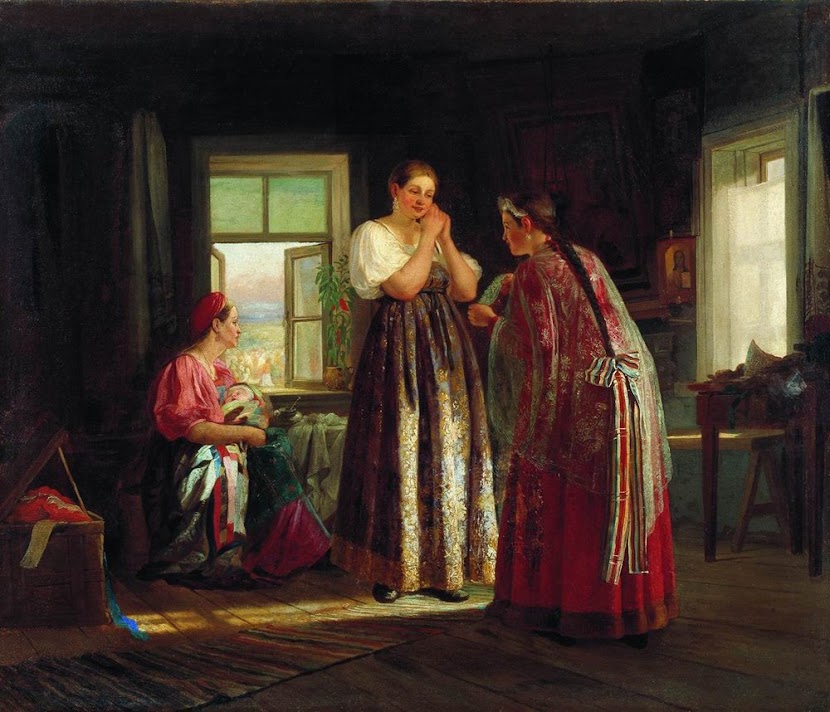 Женские и девичьи головные уборы отличались. Яркая иллюстрация тому картина Максимова. У замужней женщины волосы спрятаны под повойником, а у девушек заплетены в одну косу и выпущены из под головного убора: