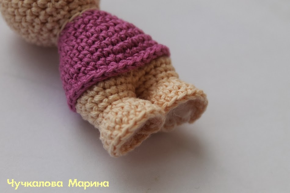 27) Вяжем 12 сбн. и складываем пополам, как бы разделив туловище на две части (ножки) и вяжем по кругу ножку, состоящую из 12 петель.