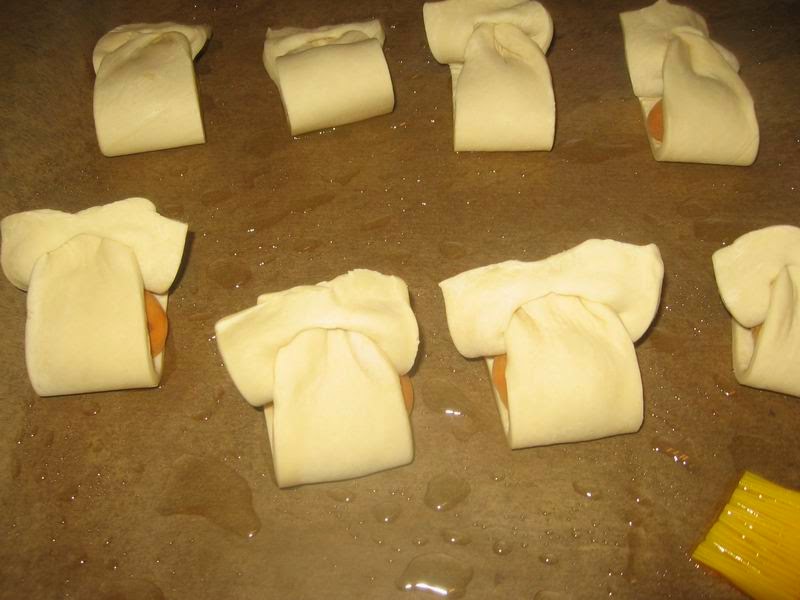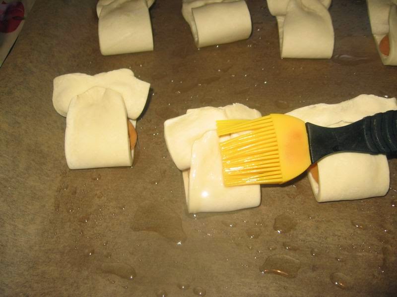 Готовые слойки выложить на противень, застеленный пергаментом. Смазать его растительным маслом.