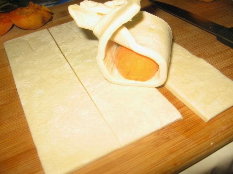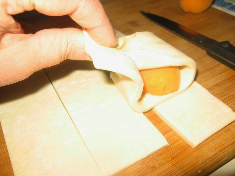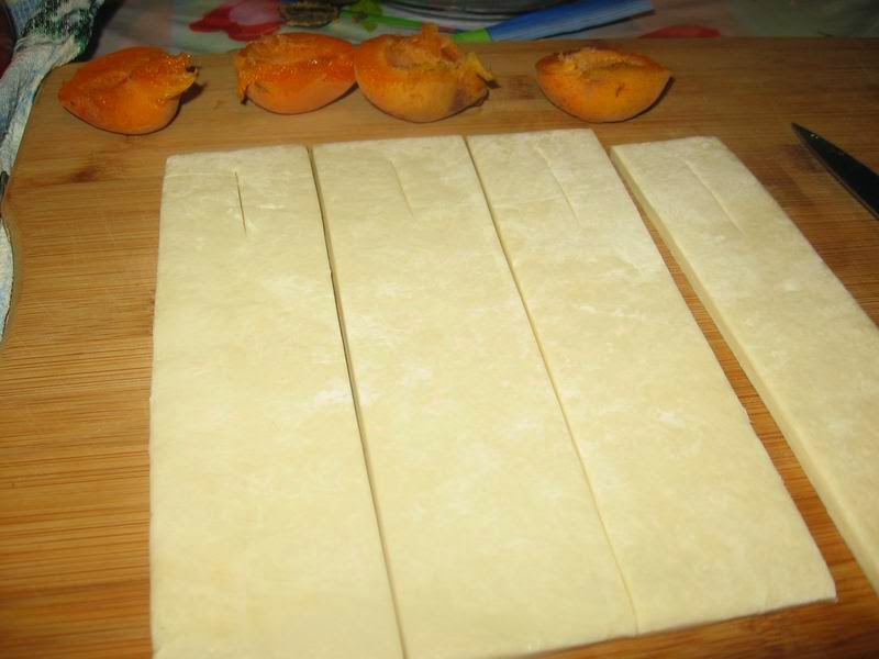 У меня было дрожжевое слоёное тесто, но и с песочным получится отлично! Вместо абрикосов можно взять любые другие фрукты. Я сахар не использовала, но можно и сахаром присыпать! Дело вкуса. Тесто достать из морозилки, дать остыть минут 15. Работать проще с тестом, которое растаяло не до конца.