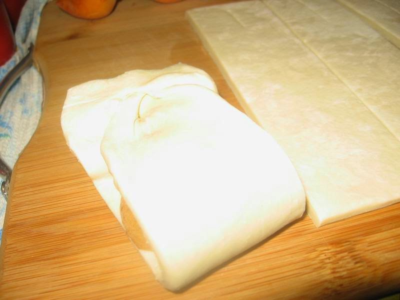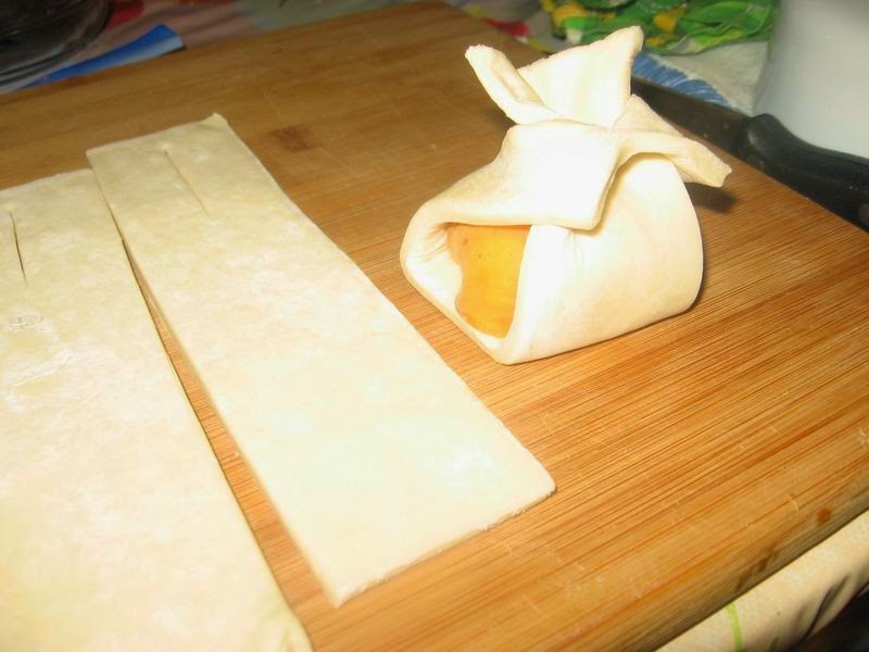 Каждую пластину теста разрезать на 4 полоски, с одной стороны полосок сделать небольшие прорези.