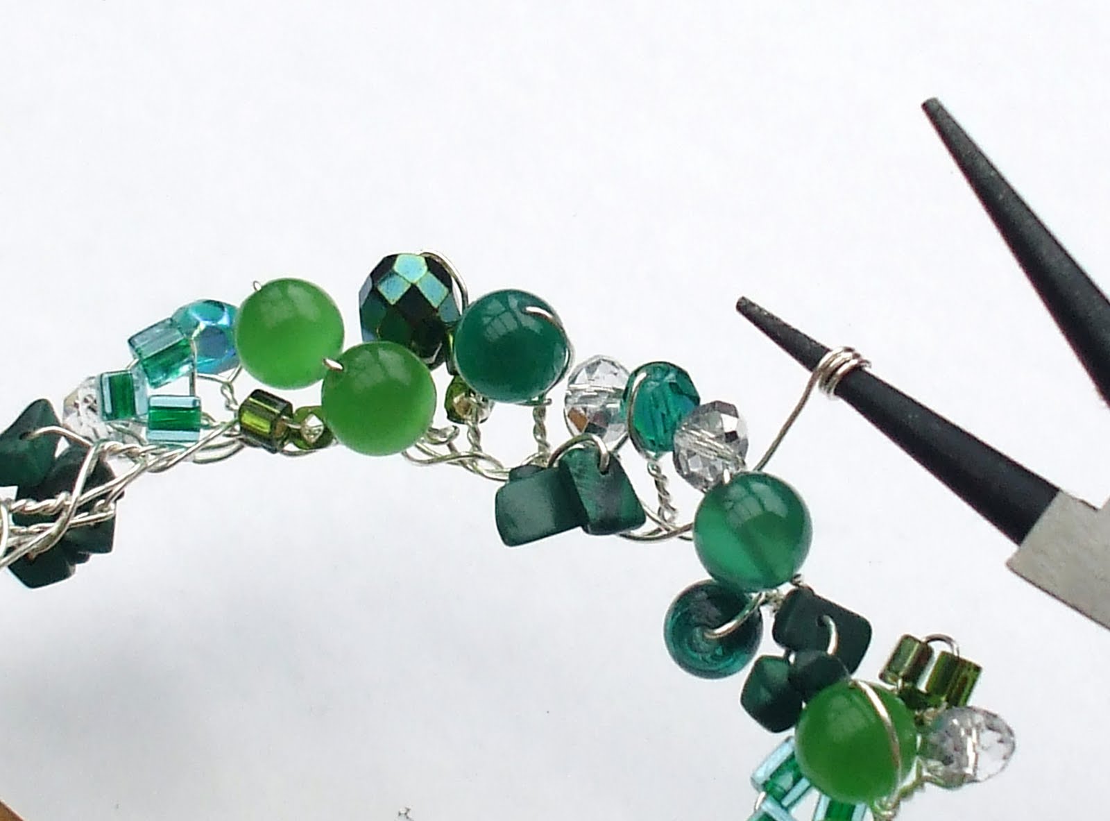 Шаг 1 - Сначала выберите бисер,который вы хотите использовать, небольшие бусины придадут больше изящества браслету. В этом варианте использовались зеленый агат, осколки малахита , бусины зеленого кошачьего глаза и бисер Тохо. Вам понадобится так же флористическая проволока серебристого цвета.