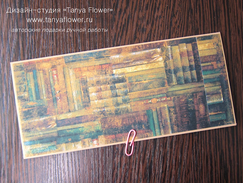 Из скрапбумаги я вырезала кусочек размером 7,5х17 см и приклеила на внешнюю сторону конверта.