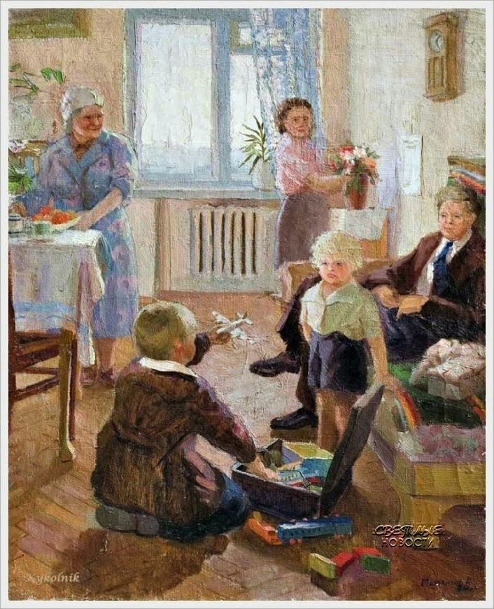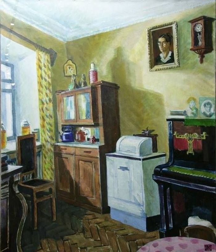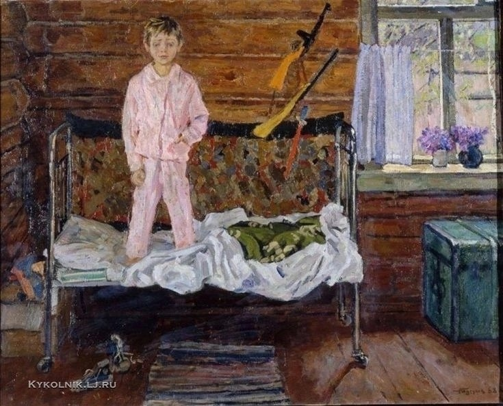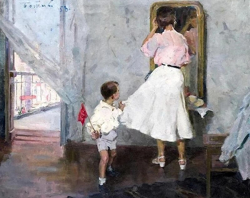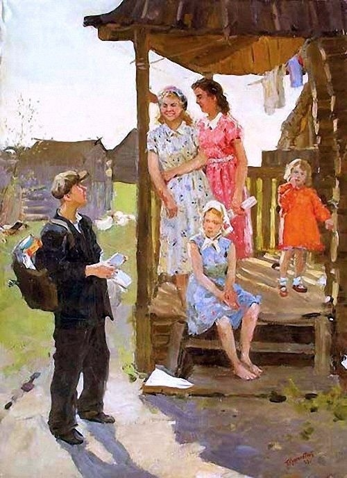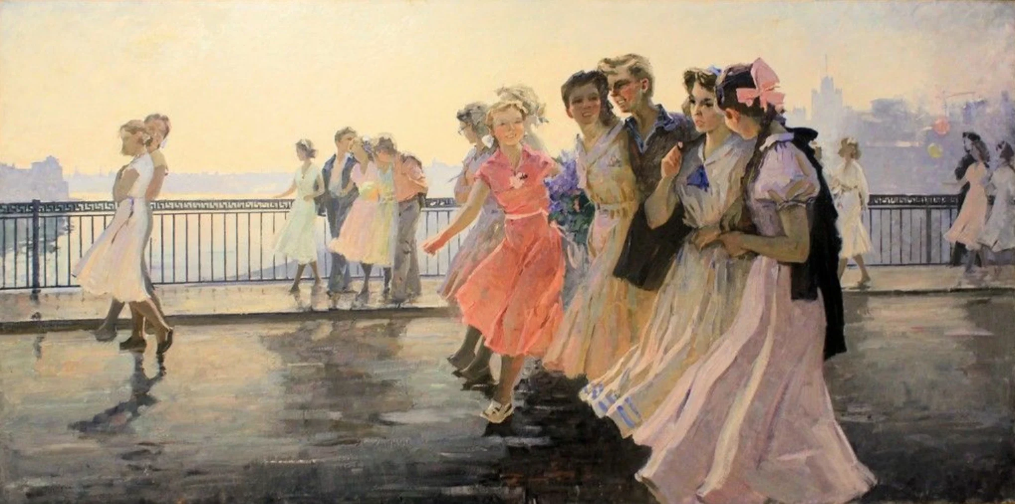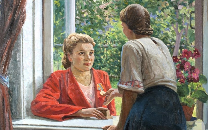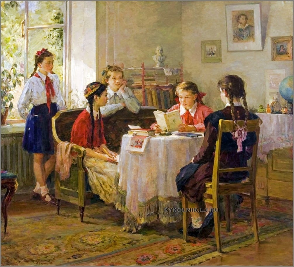 Советская живопись - это ещё и характерные для того времени элементы быта. Круглый стол, сервант или буфет, большущий комод и радиола, а может быть патефон с пластинками...Всегда очень интересно рассматривать картины, в которых остановилось время эпохи наших родителей и бабушек с дедушками. Кто-то жил в деревне, кто-то в городе. У кого-то остались воспоминания о коммунальных квартирах, которые так же нашли отражения в жанровой живописи тех времен. Из лозунга об искусстве, принадлежащем народу, вытекало и ещё одно свойство – искусство должно было стать доступным людям, независимо от уровня достатка. Картины активно тиражировались – художественные альбомы, издание которых было поставлено в Советском Союзе на поток, учебники литературы и истории, открытки, отрывные календари, иллюстрации в популярных журналах. По всей большой стране люди собирали их, развешивали вырванные листочки на стенах, создавая свои нехитрые коллекции. Сохранившиеся в памяти, у нынешних поколений эти изображения вызывают ностальгию не столько по самой советской живописи, сколько по ушедшему детству. Вся советская живопись до крайности оптимистична, ее герои кажутся суперлюдьми. В ней нет места усталости, депрессии, сомнениям – только яркое солнце, радость труда и спорта, гордость от достигнутых результатов. Картины советских художников, от которых щемит на душе – они напоминают о детстве. Итак, отправляемся назад в СССР! Вера Сорокина «Молодость». Первоначально сюжет трактовался так: девушка отстала от гонок из-за поломки, парень чинит её "коня". Но скажите сами: на гонки с букетом сирени? Скорее всего, пара просто гуляет, встретившись. И пахнет майским дождём, сиренью и разогретым асфальтом. Наверное, так пахнет счастье. Николай Ульянов «Снегири». При взгляде на стайку детворы, замершую у окна, меня охватывают забытые чувства: запах шерстяных варежек, которые раскладывали сушить на батарее; неудобство от сползающих чулок с "пажиками" - их носили все, мальчики и девочки. Картина написана в 1964 году. Тогда с местами в садик было туго, а мне повезло. Так же, как ребятишки на картине, я целый день проводил в компании сверстников. Игрушек было маловато, но они отличались исключительной прочностью. Дашкевич Александр Диомидович, "На пляже", 1960 год. Антонов Константин Михайлович, "Студентка", 1957 год. Сычков Федот Васильевич, "Жница", 1931 год. Яблонская Татьяна Ниловна, "Дома за книгой", 1954 год. Яблонская Татьяна Ниловна, "Автопортрет", 1945 год. Юон Константин Федорович, "Песни колхозной молодежи. Лигачево", 1954 год. Подляский Юрий Станиславович, "Жаркий август", 1984 год. Стожаров Владимир Федорович, "Покров", 1969 год. Павел Моисеевич Гречишкин, "Простор", 1957 год. Павел Моисеевич Гречишкин, "Озеро в облаках", 1981 год. Солодов Всеволод Сергеевич, "Дождливый день", 1958 год. Илья Сергеевич Глазунов, "Плёс. Вечер", 1952 год. Андрей Андреевич Тутунов, "Утро", 1963 год. Воронов Натан Моисеевич, "Интересная книга", 1954 год. Сорокин Сергей Александрович, "С рыбалки", 1972 год. Сорогин Геннадий Павлович, "Письмо", 1960 год. Петр Крохоняткин, "Сельский почтальон", 1959 год. Владимир Владимирович Животков, "Окно. Лето", 1970-е годы. Попов Игорь Александрович, "Июль", 1976 год. Фокин Леонид Андреевич, "Вечером", 1956 год. Киселёв Виктор Васильевич, "Мать", 1946 год. Киселёв Виктор Васильевич, "Урожай", 1960 год. Киселёв Виктор Васильевич, "Сва