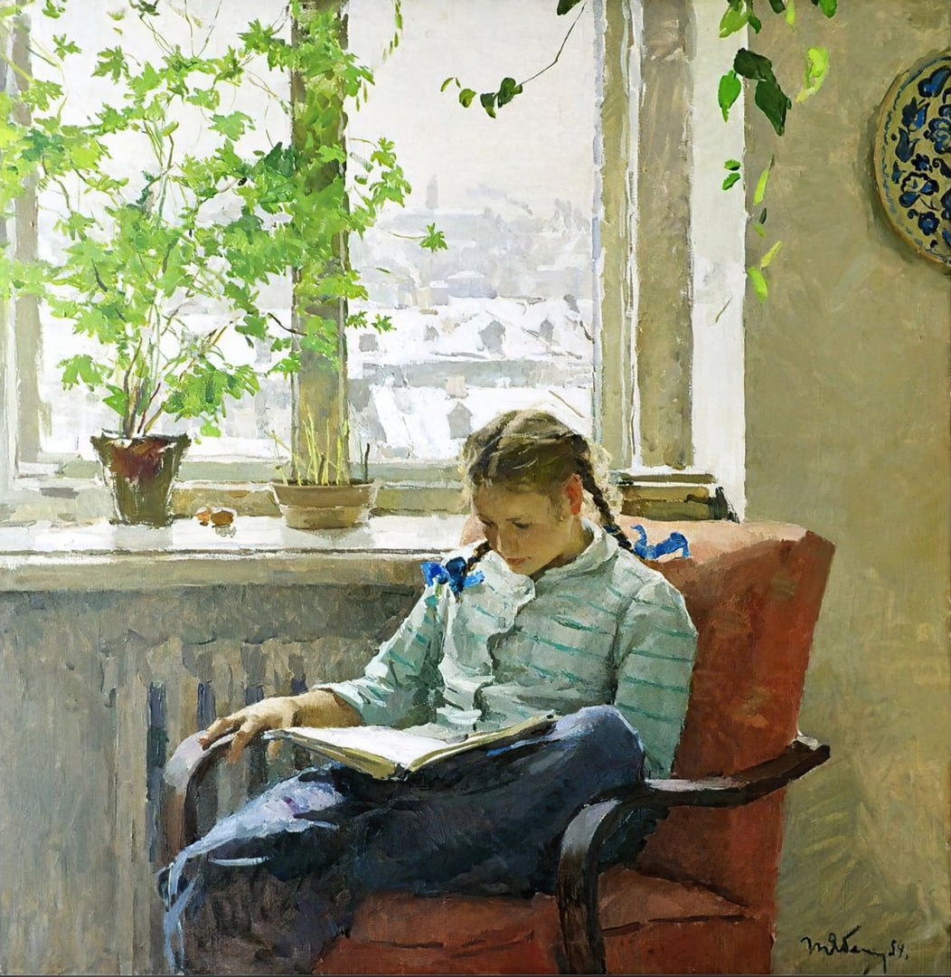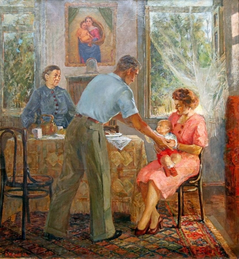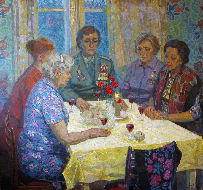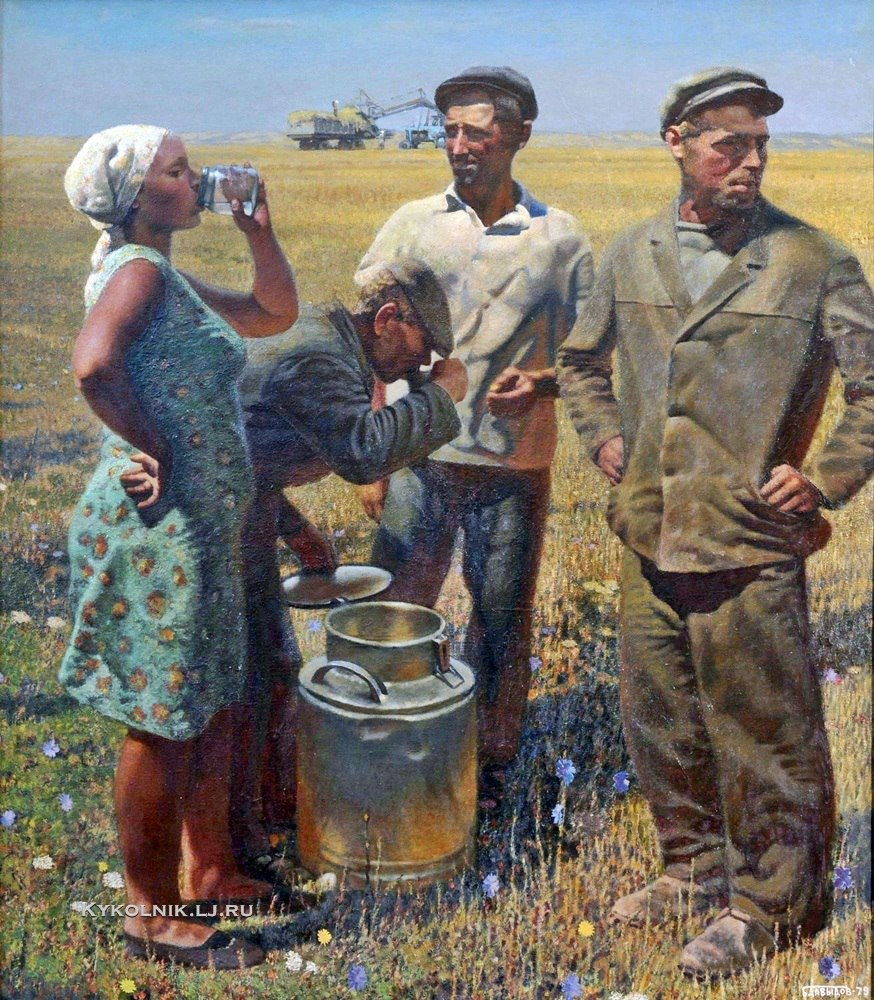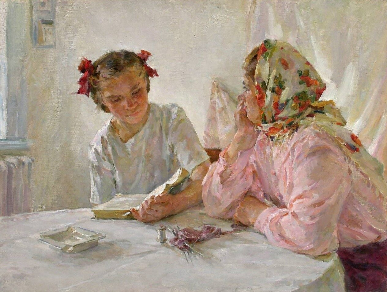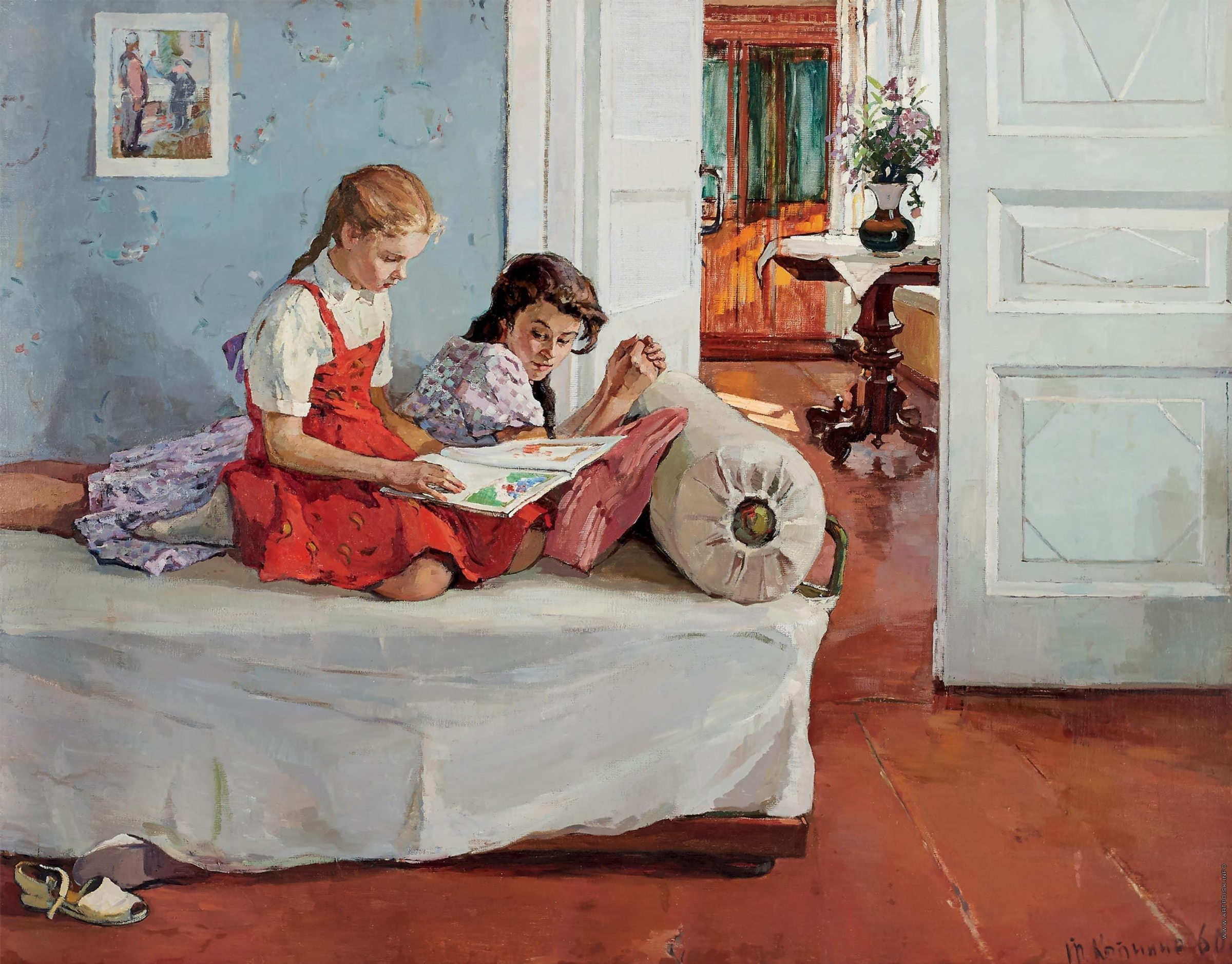 Советская живопись - это ещё и характерные для того времени элементы быта. Круглый стол, сервант или буфет, большущий комод и радиола, а может быть патефон с пластинками...Всегда очень интересно рассматривать картины, в которых остановилось время эпохи наших родителей и бабушек с дедушками. Кто-то жил в деревне, кто-то в городе. У кого-то остались воспоминания о коммунальных квартирах, которые так же нашли отражения в жанровой живописи тех времен. Из лозунга об искусстве, принадлежащем народу, вытекало и ещё одно свойство – искусство должно было стать доступным людям, независимо от уровня достатка. Картины активно тиражировались – художественные альбомы, издание которых было поставлено в Советском Союзе на поток, учебники литературы и истории, открытки, отрывные календари, иллюстрации в популярных журналах. По всей большой стране люди собирали их, развешивали вырванные листочки на стенах, создавая свои нехитрые коллекции. Сохранившиеся в памяти, у нынешних поколений эти изображения вызывают ностальгию не столько по самой советской живописи, сколько по ушедшему детству. Вся советская живопись до крайности оптимистична, ее герои кажутся суперлюдьми. В ней нет места усталости, депрессии, сомнениям – только яркое солнце, радость труда и спорта, гордость от достигнутых результатов. Картины советских художников, от которых щемит на душе – они напоминают о детстве. Итак, отправляемся назад в СССР! Вера Сорокина «Молодость». Первоначально сюжет трактовался так: девушка отстала от гонок из-за поломки, парень чинит её "коня". Но скажите сами: на гонки с букетом сирени? Скорее всего, пара просто гуляет, встретившись. И пахнет майским дождём, сиренью и разогретым асфальтом. Наверное, так пахнет счастье. Николай Ульянов «Снегири». При взгляде на стайку детворы, замершую у окна, меня охватывают забытые чувства: запах шерстяных варежек, которые раскладывали сушить на батарее; неудобство от сползающих чулок с "пажиками" - их носили все, мальчики и девочки. Картина написана в 1964 году. Тогда с местами в садик было туго, а мне повезло. Так же, как ребятишки на картине, я целый день проводил в компании сверстников. Игрушек было маловато, но они отличались исключительной прочностью. Дашкевич Александр Диомидович, "На пляже", 1960 год. Антонов Константин Михайлович, "Студентка", 1957 год. Сычков Федот Васильевич, "Жница", 1931 год. Яблонская Татьяна Ниловна, "Дома за книгой", 1954 год. Яблонская Татьяна Ниловна, "Автопортрет", 1945 год. Юон Константин Федорович, "Песни колхозной молодежи. Лигачево", 1954 год. Подляский Юрий Станиславович, "Жаркий август", 1984 год. Стожаров Владимир Федорович, "Покров", 1969 год. Павел Моисеевич Гречишкин, "Простор", 1957 год. Павел Моисеевич Гречишкин, "Озеро в облаках", 1981 год. Солодов Всеволод Сергеевич, "Дождливый день", 1958 год. Илья Сергеевич Глазунов, "Плёс. Вечер", 1952 год. Андрей Андреевич Тутунов, "Утро", 1963 год. Воронов Натан Моисеевич, "Интересная книга", 1954 год. Сорокин Сергей Александрович, "С рыбалки", 1972 год. Сорогин Геннадий Павлович, "Письмо", 1960 год. Петр Крохоняткин, "Сельский почтальон", 1959 год. Владимир Владимирович Животков, "Окно. Лето", 1970-е годы. Попов Игорь Александрович, "Июль", 1976 год. Фокин Леонид Андреевич, "Вечером", 1956 год. Киселёв Виктор Васильевич, "Мать", 1946 год. Киселёв Виктор Васильевич, "Урожай", 1960 год. Киселёв Виктор Васильевич, "Сва