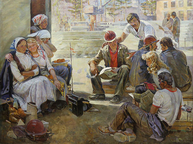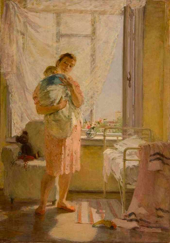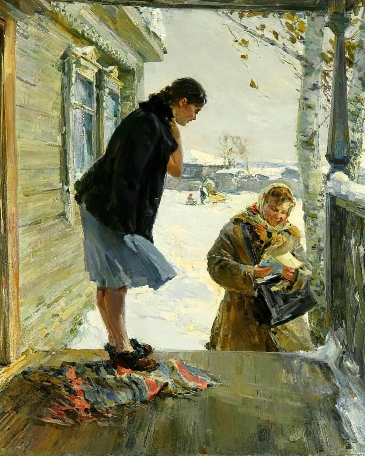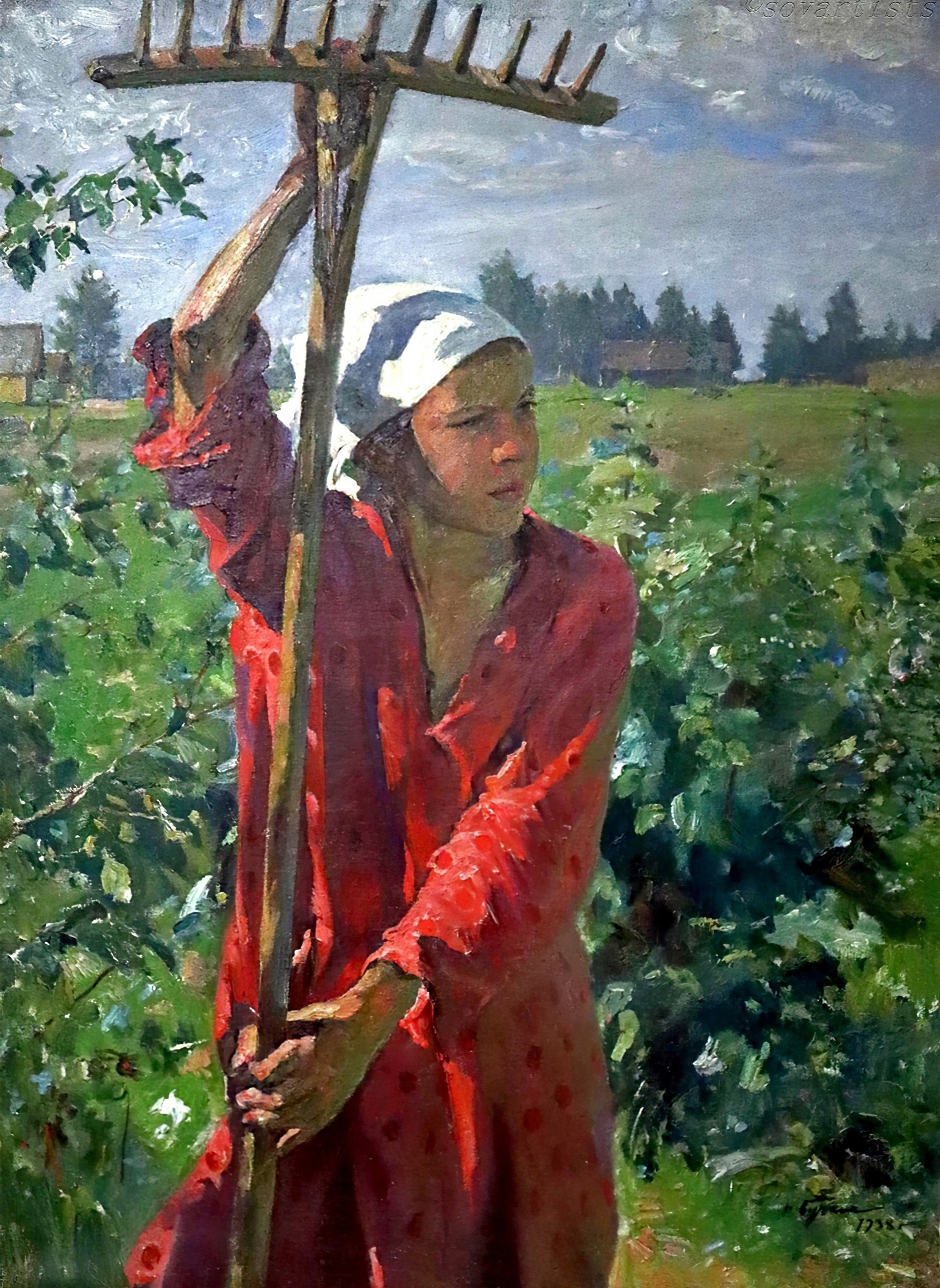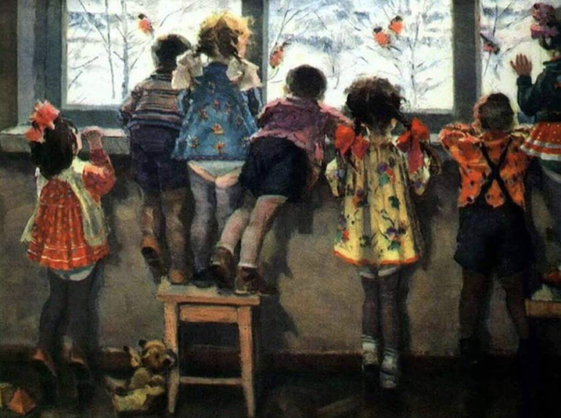 Советская живопись - это ещё и характерные для того времени элементы быта. Круглый стол, сервант или буфет, большущий комод и радиола, а может быть патефон с пластинками...Всегда очень интересно рассматривать картины, в которых остановилось время эпохи наших родителей и бабушек с дедушками. Кто-то жил в деревне, кто-то в городе. У кого-то остались воспоминания о коммунальных квартирах, которые так же нашли отражения в жанровой живописи тех времен. Из лозунга об искусстве, принадлежащем народу, вытекало и ещё одно свойство – искусство должно было стать доступным людям, независимо от уровня достатка. Картины активно тиражировались – художественные альбомы, издание которых было поставлено в Советском Союзе на поток, учебники литературы и истории, открытки, отрывные календари, иллюстрации в популярных журналах. По всей большой стране люди собирали их, развешивали вырванные листочки на стенах, создавая свои нехитрые коллекции. Сохранившиеся в памяти, у нынешних поколений эти изображения вызывают ностальгию не столько по самой советской живописи, сколько по ушедшему детству. Вся советская живопись до крайности оптимистична, ее герои кажутся суперлюдьми. В ней нет места усталости, депрессии, сомнениям – только яркое солнце, радость труда и спорта, гордость от достигнутых результатов. Картины советских художников, от которых щемит на душе – они напоминают о детстве. Итак, отправляемся назад в СССР! Вера Сорокина «Молодость». Первоначально сюжет трактовался так: девушка отстала от гонок из-за поломки, парень чинит её "коня". Но скажите сами: на гонки с букетом сирени? Скорее всего, пара просто гуляет, встретившись. И пахнет майским дождём, сиренью и разогретым асфальтом. Наверное, так пахнет счастье. Николай Ульянов «Снегири». При взгляде на стайку детворы, замершую у окна, меня охватывают забытые чувства: запах шерстяных варежек, которые раскладывали сушить на батарее; неудобство от сползающих чулок с "пажиками" - их носили все, мальчики и девочки. Картина написана в 1964 году. Тогда с местами в садик было туго, а мне повезло. Так же, как ребятишки на картине, я целый день проводил в компании сверстников. Игрушек было маловато, но они отличались исключительной прочностью. Дашкевич Александр Диомидович, "На пляже", 1960 год. Антонов Константин Михайлович, "Студентка", 1957 год. Сычков Федот Васильевич, "Жница", 1931 год. Яблонская Татьяна Ниловна, "Дома за книгой", 1954 год. Яблонская Татьяна Ниловна, "Автопортрет", 1945 год. Юон Константин Федорович, "Песни колхозной молодежи. Лигачево", 1954 год. Подляский Юрий Станиславович, "Жаркий август", 1984 год. Стожаров Владимир Федорович, "Покров", 1969 год. Павел Моисеевич Гречишкин, "Простор", 1957 год. Павел Моисеевич Гречишкин, "Озеро в облаках", 1981 год. Солодов Всеволод Сергеевич, "Дождливый день", 1958 год. Илья Сергеевич Глазунов, "Плёс. Вечер", 1952 год. Андрей Андреевич Тутунов, "Утро", 1963 год. Воронов Натан Моисеевич, "Интересная книга", 1954 год. Сорокин Сергей Александрович, "С рыбалки", 1972 год. Сорогин Геннадий Павлович, "Письмо", 1960 год. Петр Крохоняткин, "Сельский почтальон", 1959 год. Владимир Владимирович Животков, "Окно. Лето", 1970-е годы. Попов Игорь Александрович, "Июль", 1976 год. Фокин Леонид Андреевич, "Вечером", 1956 год. Киселёв Виктор Васильевич, "Мать", 1946 год. Киселёв Виктор Васильевич, "Урожай", 1960 год. Киселёв Виктор Васильевич, "Сва
