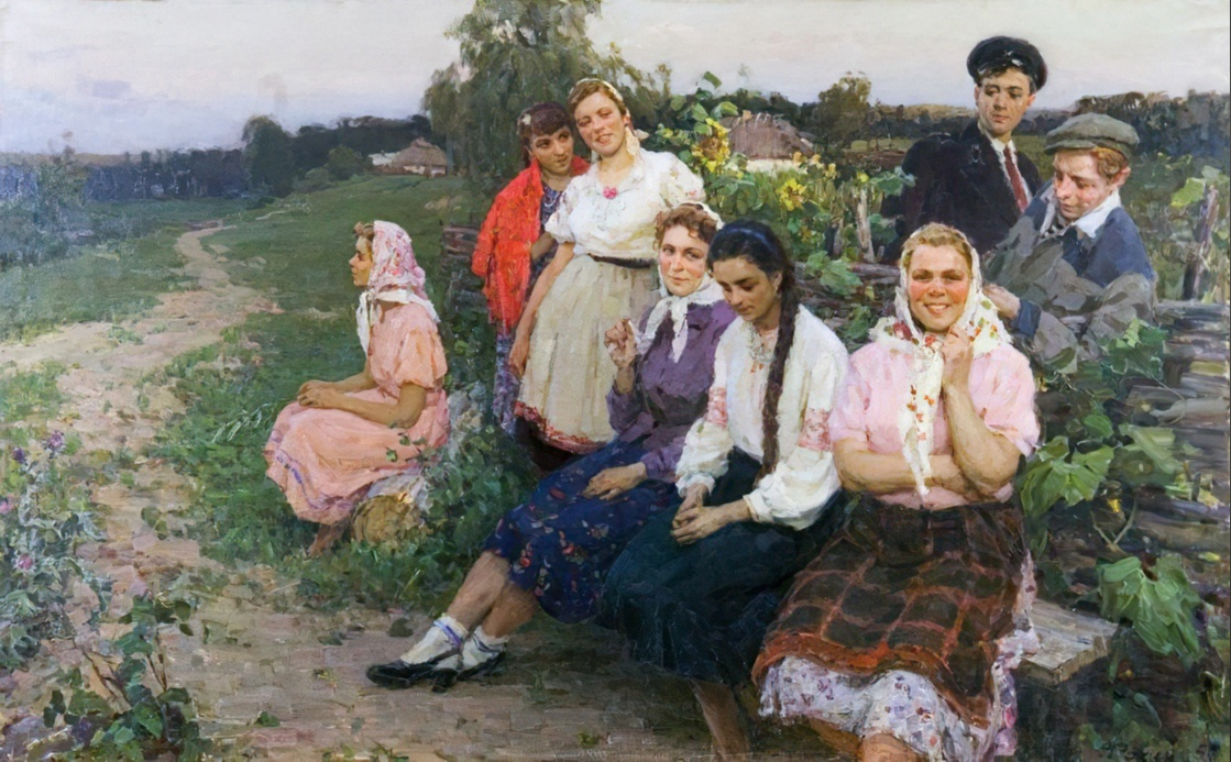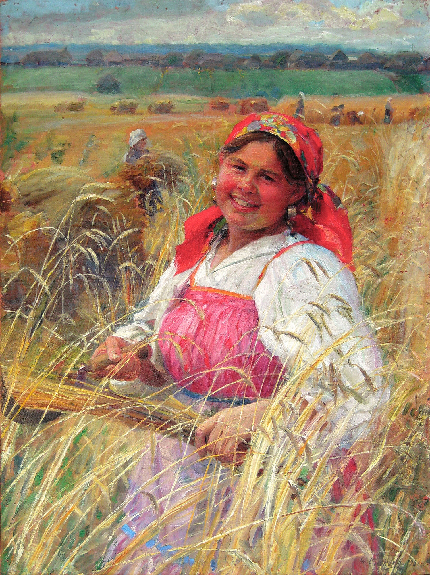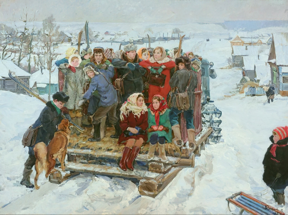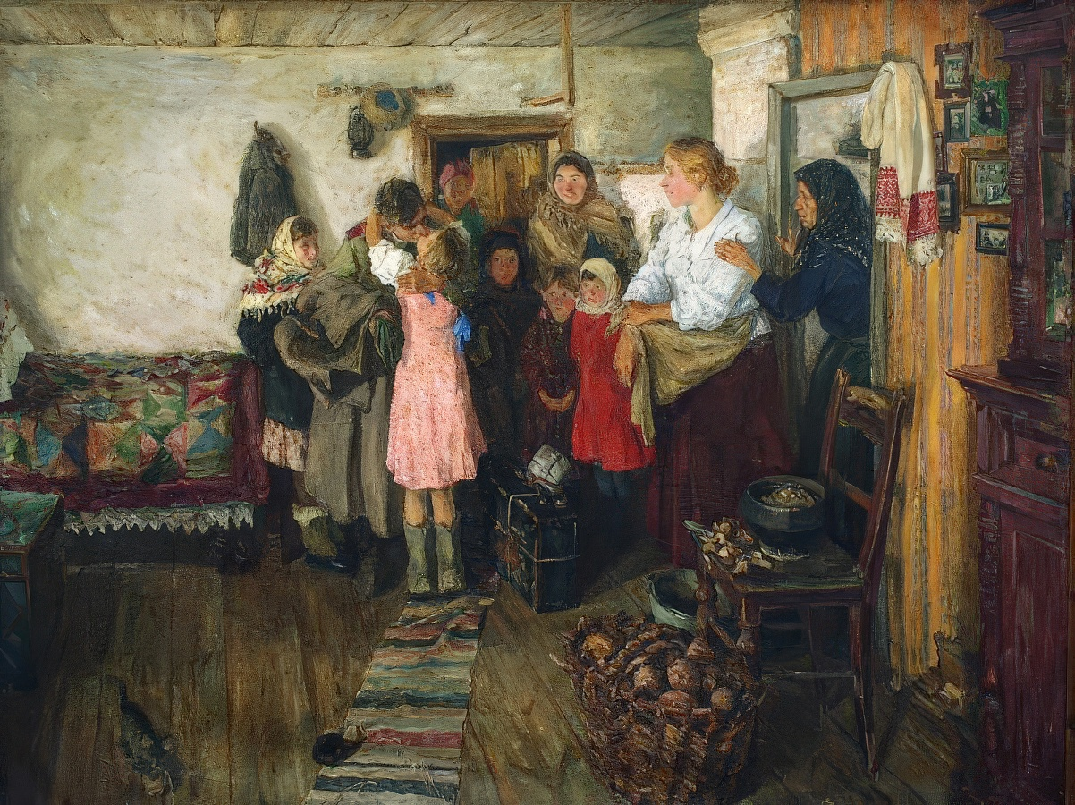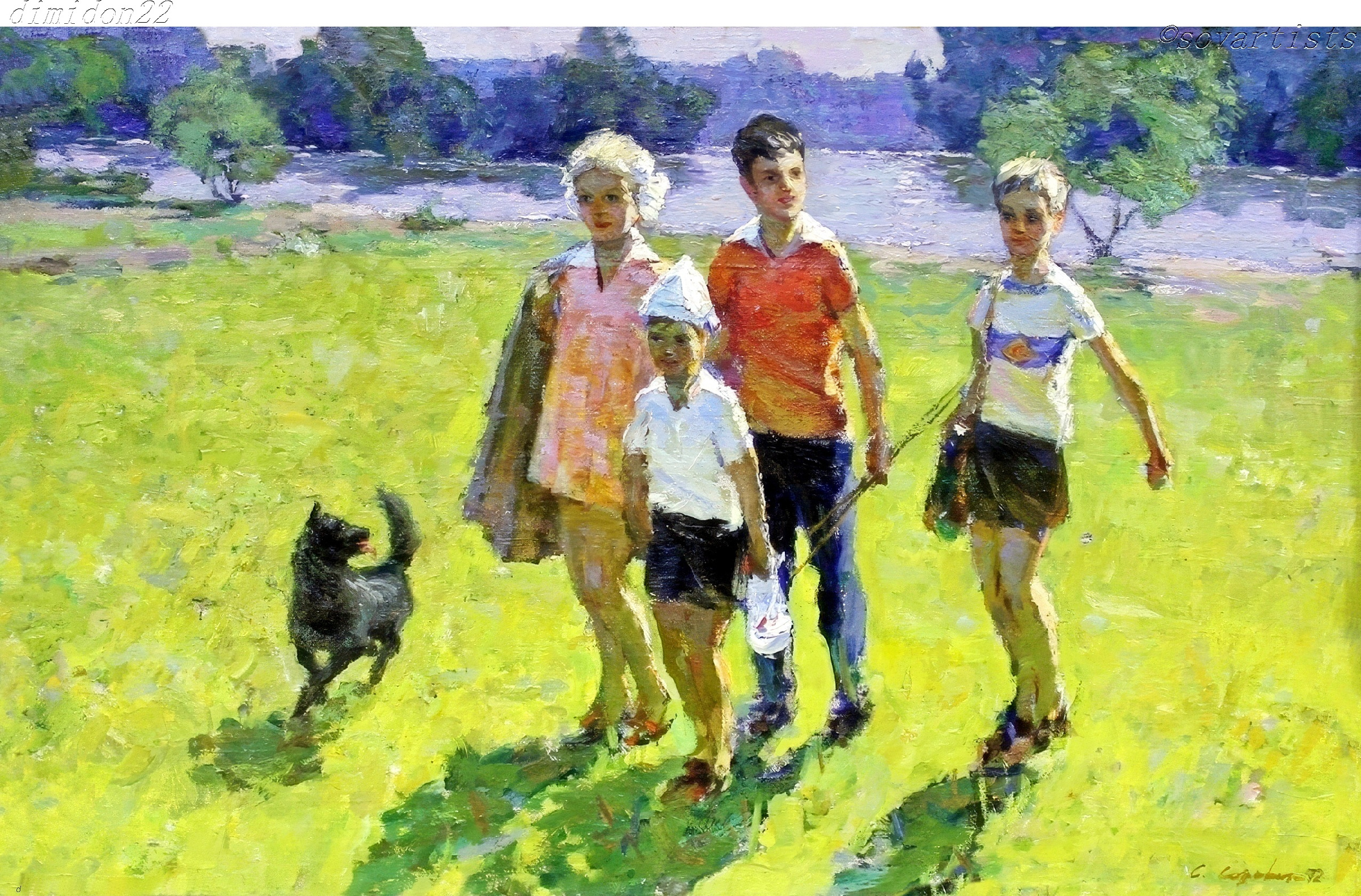 Советская живопись - это ещё и характерные для того времени элементы быта. Круглый стол, сервант или буфет, большущий комод и радиола, а может быть патефон с пластинками...Всегда очень интересно рассматривать картины, в которых остановилось время эпохи наших родителей и бабушек с дедушками. Кто-то жил в деревне, кто-то в городе. У кого-то остались воспоминания о коммунальных квартирах, которые так же нашли отражения в жанровой живописи тех времен. Из лозунга об искусстве, принадлежащем народу, вытекало и ещё одно свойство – искусство должно было стать доступным людям, независимо от уровня достатка. Картины активно тиражировались – художественные альбомы, издание которых было поставлено в Советском Союзе на поток, учебники литературы и истории, открытки, отрывные календари, иллюстрации в популярных журналах. По всей большой стране люди собирали их, развешивали вырванные листочки на стенах, создавая свои нехитрые коллекции. Сохранившиеся в памяти, у нынешних поколений эти изображения вызывают ностальгию не столько по самой советской живописи, сколько по ушедшему детству. Вся советская живопись до крайности оптимистична, ее герои кажутся суперлюдьми. В ней нет места усталости, депрессии, сомнениям – только яркое солнце, радость труда и спорта, гордость от достигнутых результатов. Картины советских художников, от которых щемит на душе – они напоминают о детстве. Итак, отправляемся назад в СССР! Вера Сорокина «Молодость». Первоначально сюжет трактовался так: девушка отстала от гонок из-за поломки, парень чинит её "коня". Но скажите сами: на гонки с букетом сирени? Скорее всего, пара просто гуляет, встретившись. И пахнет майским дождём, сиренью и разогретым асфальтом. Наверное, так пахнет счастье. Николай Ульянов «Снегири». При взгляде на стайку детворы, замершую у окна, меня охватывают забытые чувства: запах шерстяных варежек, которые раскладывали сушить на батарее; неудобство от сползающих чулок с "пажиками" - их носили все, мальчики и девочки. Картина написана в 1964 году. Тогда с местами в садик было туго, а мне повезло. Так же, как ребятишки на картине, я целый день проводил в компании сверстников. Игрушек было маловато, но они отличались исключительной прочностью. Дашкевич Александр Диомидович, "На пляже", 1960 год. Антонов Константин Михайлович, "Студентка", 1957 год. Сычков Федот Васильевич, "Жница", 1931 год. Яблонская Татьяна Ниловна, "Дома за книгой", 1954 год. Яблонская Татьяна Ниловна, "Автопортрет", 1945 год. Юон Константин Федорович, "Песни колхозной молодежи. Лигачево", 1954 год. Подляский Юрий Станиславович, "Жаркий август", 1984 год. Стожаров Владимир Федорович, "Покров", 1969 год. Павел Моисеевич Гречишкин, "Простор", 1957 год. Павел Моисеевич Гречишкин, "Озеро в облаках", 1981 год. Солодов Всеволод Сергеевич, "Дождливый день", 1958 год. Илья Сергеевич Глазунов, "Плёс. Вечер", 1952 год. Андрей Андреевич Тутунов, "Утро", 1963 год. Воронов Натан Моисеевич, "Интересная книга", 1954 год. Сорокин Сергей Александрович, "С рыбалки", 1972 год. Сорогин Геннадий Павлович, "Письмо", 1960 год. Петр Крохоняткин, "Сельский почтальон", 1959 год. Владимир Владимирович Животков, "Окно. Лето", 1970-е годы. Попов Игорь Александрович, "Июль", 1976 год. Фокин Леонид Андреевич, "Вечером", 1956 год. Киселёв Виктор Васильевич, "Мать", 1946 год. Киселёв Виктор Васильевич, "Урожай", 1960 год. Киселёв Виктор Васильевич, "Сва