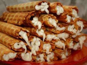 1. СЛАДКИЕ ВАФЛИ. Ингредиенты: ● — яйца – 5 шт. ● — сахар – 1 стакан ● — маргарин – 200 гр. ● — мука – 1 стакан Способ приготовления: Яйца взбить с сахаром. Маргарин растопить. Смешать яичную смесь, маргарин и муку. Дожно получиться тесто консистенцией сметаны. 2. РАССЫПЧАТЫЕ ВАФЛИ. Ингредиенты: ● — Картофельная мука — 1 стакан ● — Маргарин — 100 г. ● — Сахар — 1/2 стакана ● — Яйцо — 3 шт. ● — Лимон — 1шт. Способ приготовления: Взбить яйца с сахаром, слегка охлажденный растопленный маргарин влить во взбитые яйца, усиленно перемешивая. Добавить картофельную муку, тертую корку лимона и размешать. 3. НЕЖНЫЕ ВАФЛИ Ингредиенты: ● — Маргарин — 125 г. ● — Сахар — 30 г. ● — Мука — 100 г. ● — Яйцо — 4 шт. ● — Сливки —4 ст. ложки ● — Ванилин — по вкусу Способ приготовления: Взбить маргарин, к нему понемногу добавить сахарный песок Яйца взбить до образования пены. Муку засыпать во взбитый маргарин порциями, чередуя с порциями сливок, постепенно перемешивая. В хорошо размешанное тесто вливают взбитые яйца и еще раз хорошо подмешивают. 4. ПРЕСНЫЕ ВАФЛИ Ингредиенты: ● — Мука — 1 стакан ● — Яйцо — 1 шт. ● — Вода — 1 стакан ● — Соль, сода — на кончике чайной ложки Способ приготовления: Яичный желток соль и соду хорошо перемешать. Добавить полстакана воды, всыпать всю муку и тщательно перемешать, постепенно доливая остальную воду. Для получения сладких вафель добавить 2 столовые ложки сахара. 5. ПЕСОЧНЫЕ ВАФЛИ Ингредиенты: ● — Мука — 2 стакана ● — Сахар — 1/2 стакана ● — Яйцо — 1 шт. ● — Масло сливочное — 30 г. ● — Вода — 0,5 л. ● — Соль, сода — на кончике чайной ложки ● — Ванилин — по вкусу Способ приготовления: Масло комнатной температуры растереть с сахаром, добавить яйцо, соль, соду, ванилин и хорошо взбить. Добавить половину порции воды, положить муку и тщательно перемешать. Затем постепенно долить остальную порцию. 6. ВАФЛИ НА КЕФИРЕ (не сладкие) Ингредиенты: ● — 1 1/2 стакана муки ● — 1 ч. л. разрыхлителя ● — 1 ч. л. соды ● — 1/2 ч. л. соли ● — 2 стакана кефира ● — 1/3 стакана растительного масла ● — 2 яйца 7. ВАФЛИ НА МОЛОКЕ Ингредиенты: ● — 0,5 л молока ● — 1/2 пачки маргарина ● — 1 яйцо ● — 250 г сахара (я беру меньше - где-то 200 г) ● — ванилин Способ приготовления: Маргарин растопить. Добавить яйцо, сахар, ванилин, перемешать миксером. Далее есть хитрость: чтобы тесто получилось без комочков, то я вначале добавляю муку и размешиваю, а потом по чуть-чуть добавляю молоко. Если тесто становится жидким - опять муку, разбавляю молоком. И так, пока примерно 0,5 л молока не израсходуются. Тесто должно получиться как густая сметана (но не деревенская, где ложка стоит). 8. ВАФЛИ НА СГУЩЁНКЕ Ингредиенты: ● — маргарин 200 г; ● — сгущенное молоко 1 банка; ● — яйца 2 шт; ● — крахмал 1 стакан; ● — мука 1 стакан; ● — сода (1/3 ч. л.), гашеная уксусом. Способ приготовления: Маргарин размять, перемешать все ингредиенты, тесто не должно быть жидким. Немного теста класть на основание вафельницы, следить, чтобы вафли не сгорали. Перед первой вафлей надо смазать вафельницу (обе поверхности), затем масло не нужно. Чтобы вафли были одинаковыми по цвету, слежу по часам с секундной стрелкой. Как только вафля готова, скручиваю ее трубочкой. Пробовала разные рецепты, но все не нравилось, если за один раз не съешь, вафли становились мягкими, а эти долго остаются хрустящими. 9. ВАФЛИ НА СМЕТАНЕ Ингредиенты: ● — Яйца - 5ш
