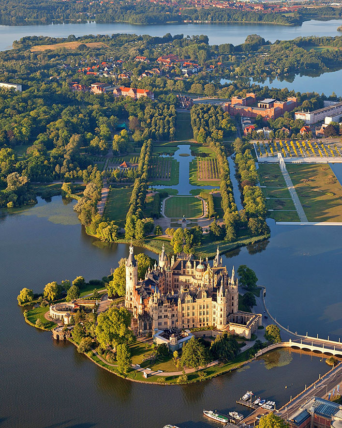 Шверинский замок — архитектурный шедевр, состоящий из 653 комнат и десятков остроконечных башен. Он расположен на острове посреди озера Шверин, откуда открывается потрясающий вид на воду.