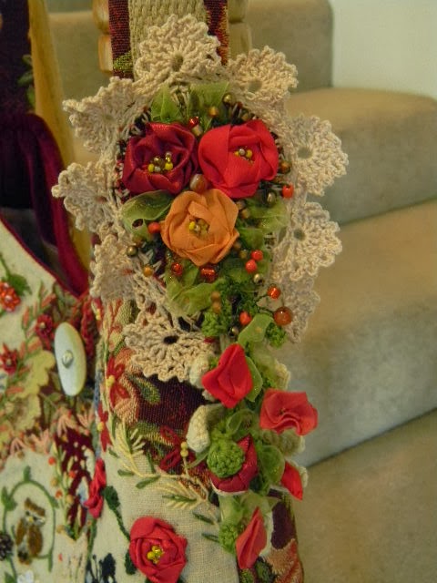 Cледующие два фрагмента с вязанными мотивами,вышивкой лентами,бисером,пуговками,..
