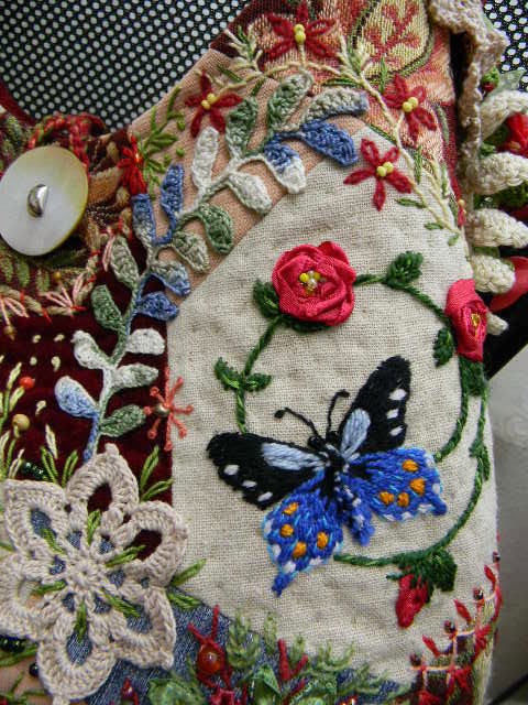Правый верхний фрагмент с вышивкой бабочки(..куда ж без них то?!..:))..и опять вязанные элементы,ленточки,...