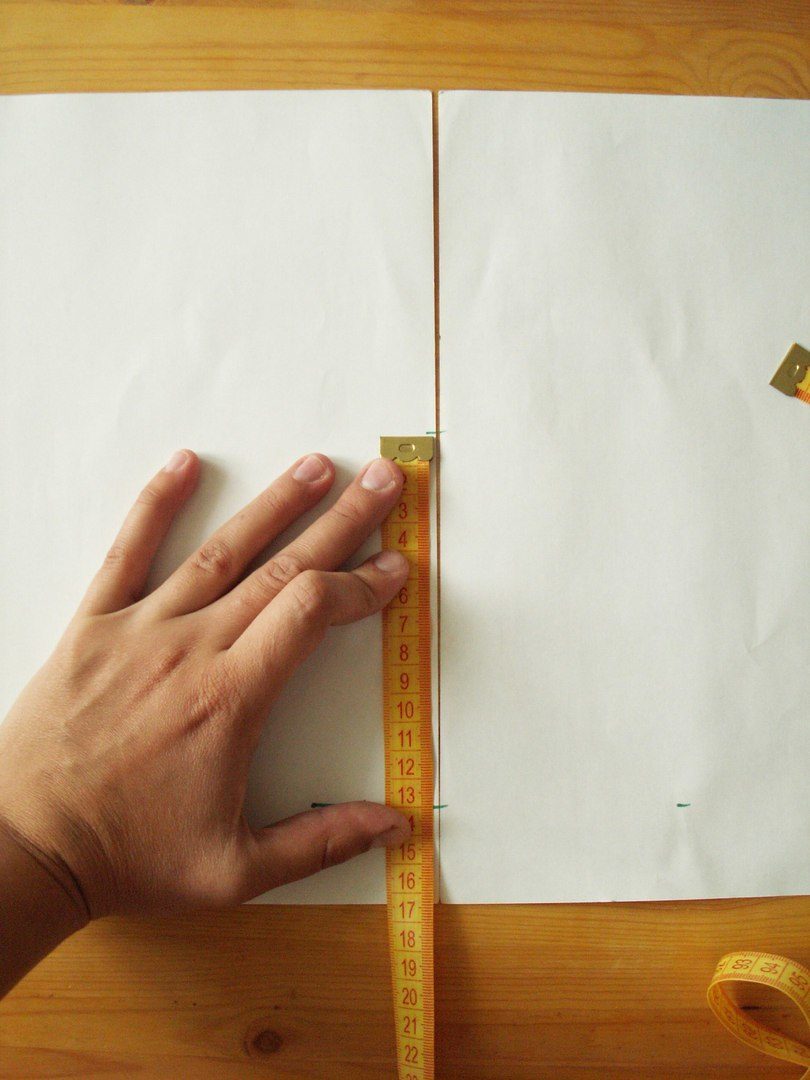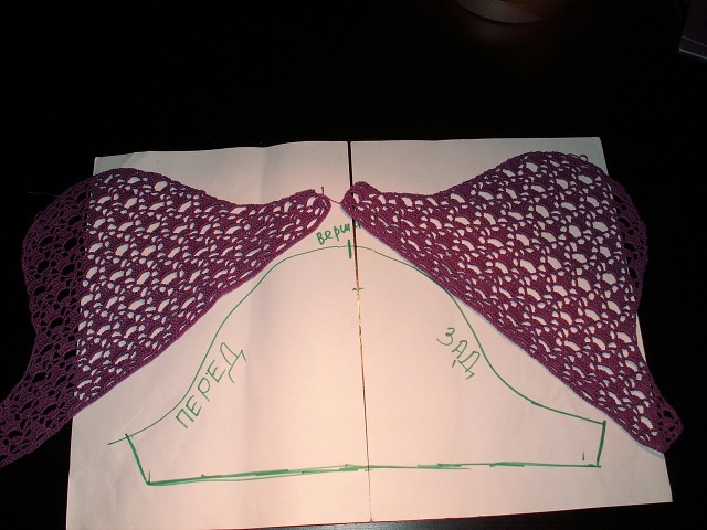 Затем располагаем наше сшитое изделие в плечах (полочки и спинка) так чтобы, плечевой шов касался верхней отметки, а нижние точки окатов полочки и спинки оказались внизу, как бы выкладываем горку для катания ( можно приготовить скотч, чтобы закрепить - я делала быстро без него) - эти точки не должны уходить в отметки нижней линии...
