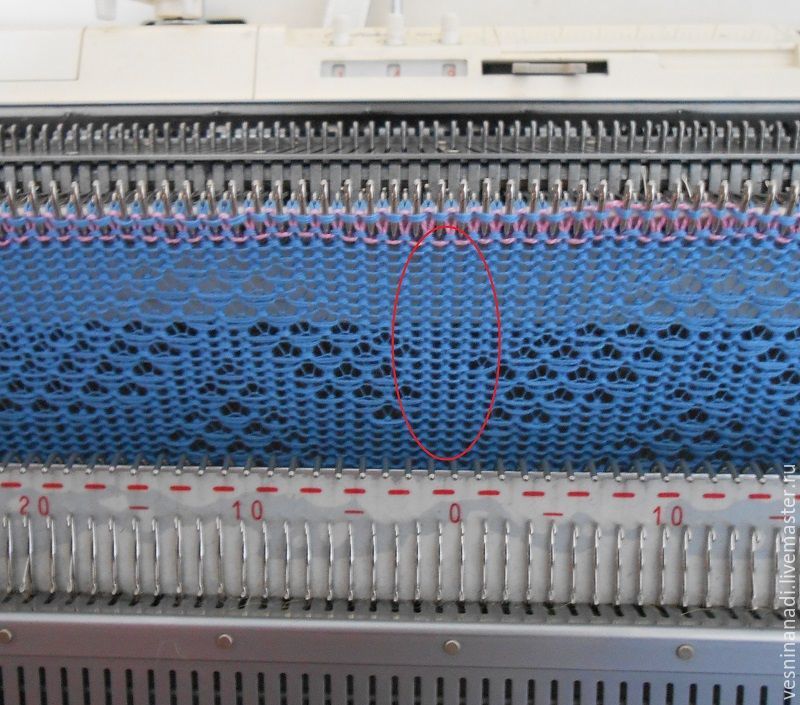 Начинаем вязание с бросовой нити, так как край изделия будет обвязан крючком. Вяжем до 95 ряда, помечаем две центральные петли, до них мы будем делать разрез поцентру полотна. Если центральные иглы отбираются по рисунку, задвигаем их в положение В (задвигать будем до 199 ряда). Задвигаем по две иглы с каждой стороны от нуля, формируется такая дорожка: