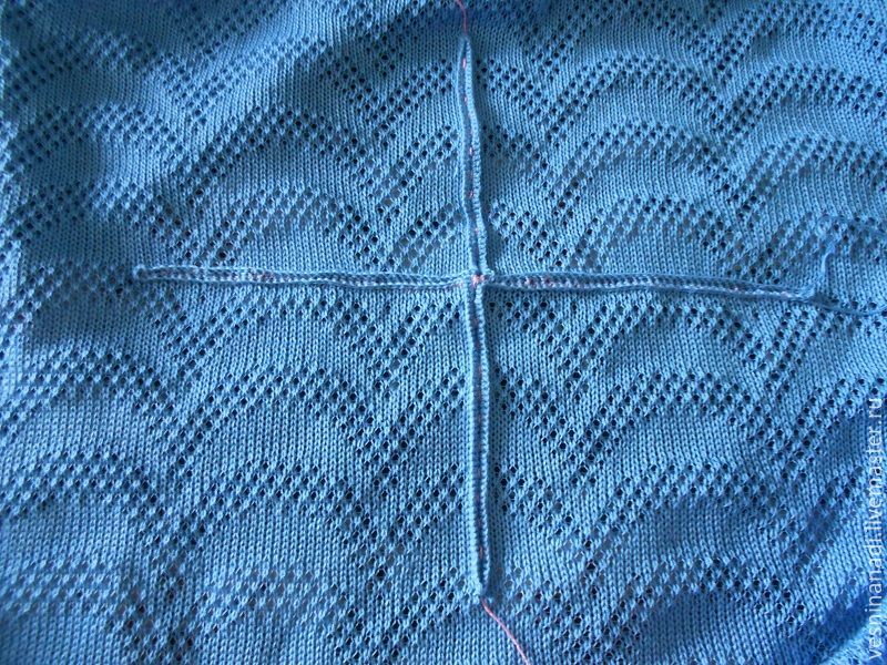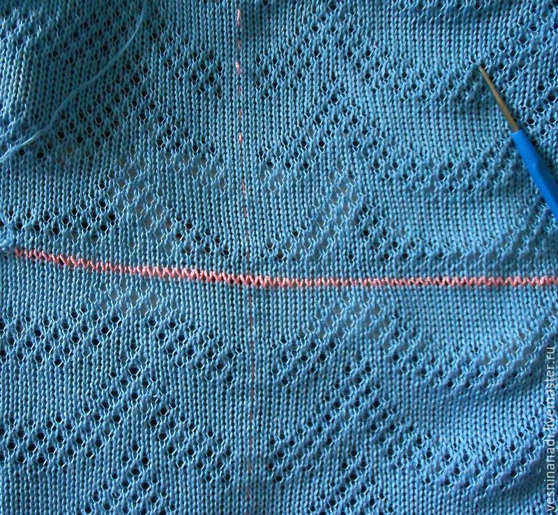 Приступаем к обработке пройм. Где идёт вертикальная дорожка из 4-х петель, контрастной нитью намечаем середину.