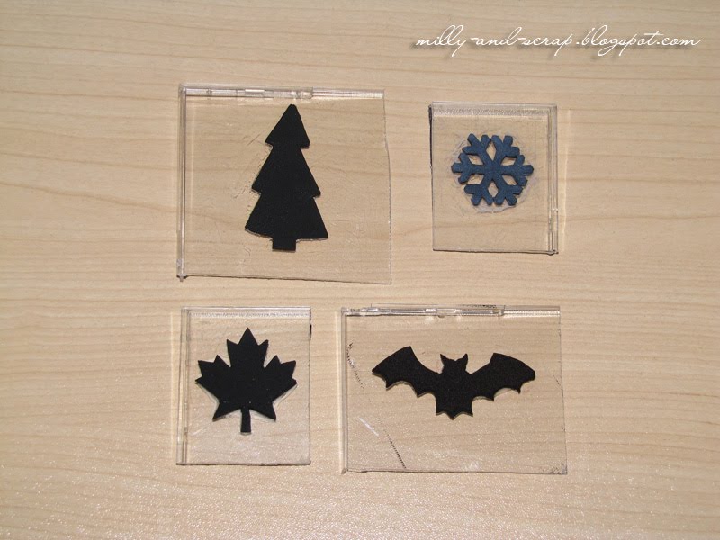 На полученные после распила блоки пластика я приклеила (уже основательно) свои штампики - у каждого появилась своя основа. Ими удобно работать, потому что пластик прозрачный, как акриловые блоки для силиконовых штампов. А резиновый коврик хорошо тонируется чернилами. В итоге у меня появилась сразу большая коллекция штампиков, на которую ушло 1,5 коврика для мыши: