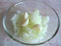 Из лука, чеснока и говядины сделать фарш, порубив все ингредиенты в блендере.
