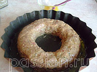 Из фарша сформовать кольцо, выложить его в форму для запекания, предварительно смазанную маслом.
