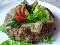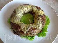 За 5 минут до готовности мясное кольцо вынуть, уложить на него кусочки сыра и запекать до готовности.