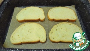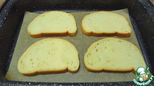 Ломтики батона отправляю подсушиться в заранее разогретую до 200°C духовку на 3-5 минут.