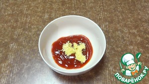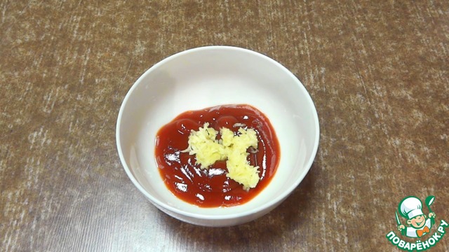 Тем временем смешаю кетчуп (томатный соус) с измельченным чесноком.