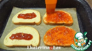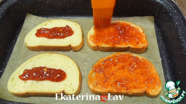 На подсушенный хлеб раскладываю томатно-чесночную смесь и распределяю по всей поверхности.