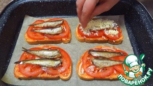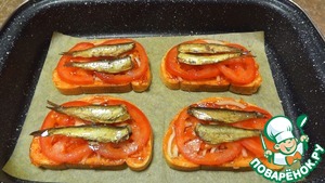 На помидоры раскладываю шпроты (по 2 шт. на каждый бутерброд).