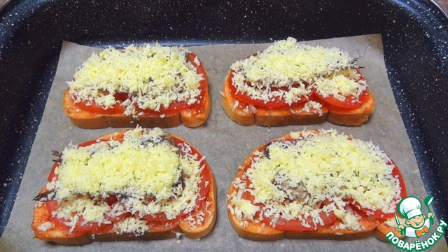 Запекаю бутерброды в разогретой до 200°C духовке 10-15 минут. Сыр должен красиво расплавиться.