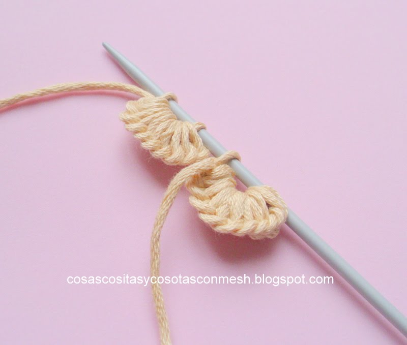Ahora tejeremos la puntilla a 2 agujas y para eso haremos 3 aumentos a cada abanico .
