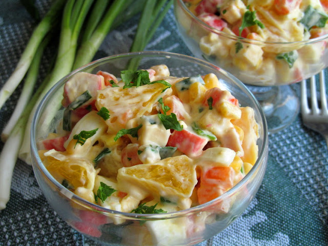 Крабовые палочки нарезать поперек колечками. Апельсины очистить от кожицы, разобрать на дольки и нарезать их небольшими кусочками. Отварные яйца, морковь и сыр нарезать кубиками. С кукурузы слить жидкость. Зеленый лук мелко порубить ножом.