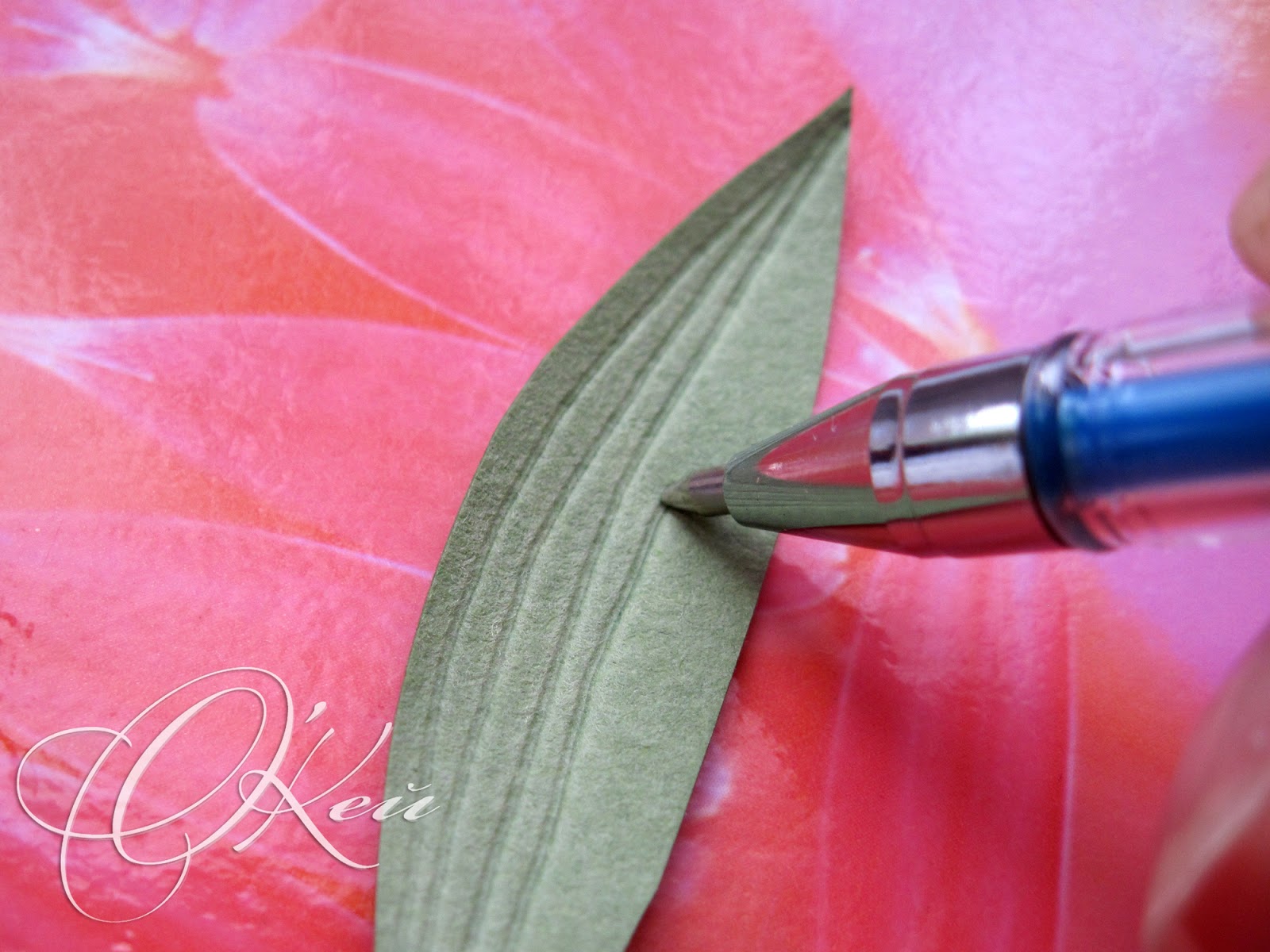 Следующий шаг - промазываем клеем оставшиеся лепестки и приклеиваем к основе бутона.Пока подсыхают окончательно цветочки (их можно положить на батарею), тисним листья! Для этого лучше подходит стержень, стека или спица.