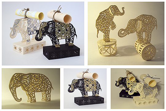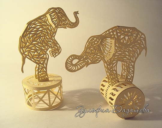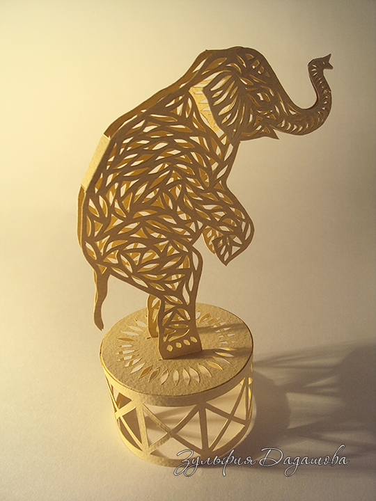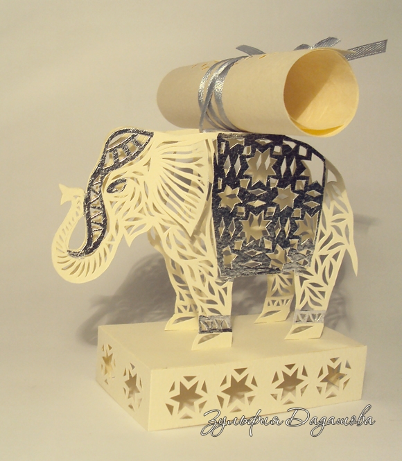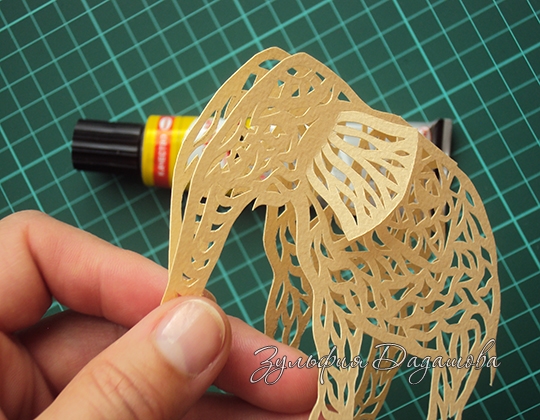 Вставить ноги слона в прорези в верхней части подставки. Со стороны головы расстояние до прорезей больше.