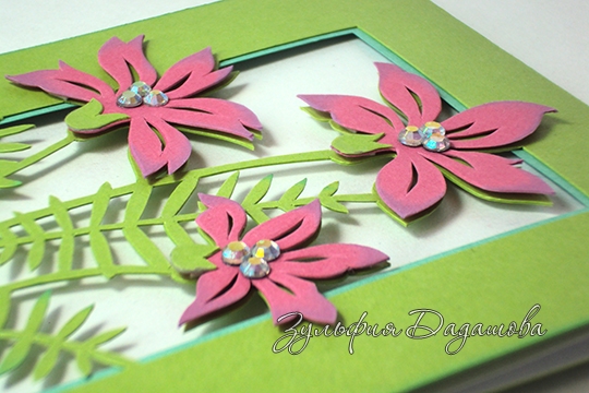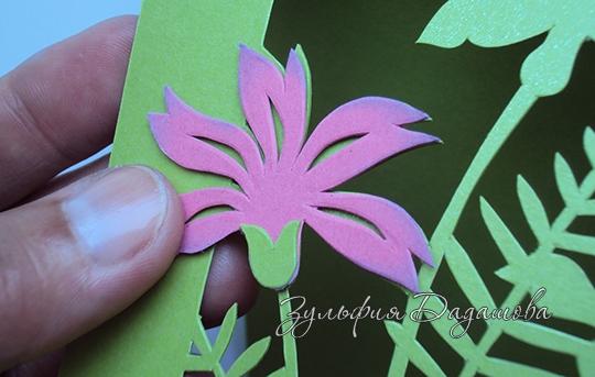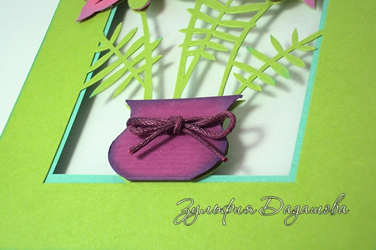 Приклейте детали на лицевую сторону открытки. Из белой бумаги меньшей плотности вырежьте вкладыш по размеру открытки. Приклейте вкладыш внутрь открытки к задней стороне. Из плотной бумаги холодного зеленого оттенка вырежьте по схеме прямоугольную рамку (каемку) и приклейте к окошку с внутренней стороны. Горлышко горшка можно перевязать декоративным шнуром или ленточкой в тон, но сделать это нужно до приклеивания детали на открытку. В середину цветов можно приклеить стразы.