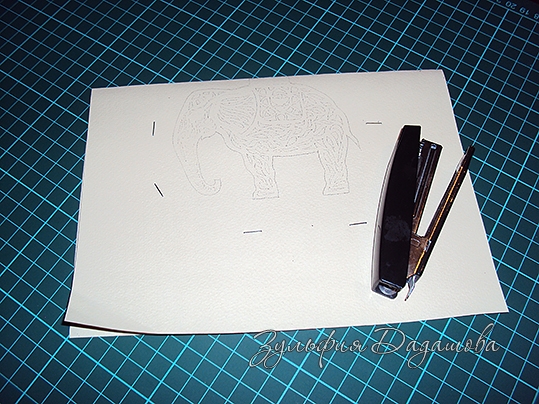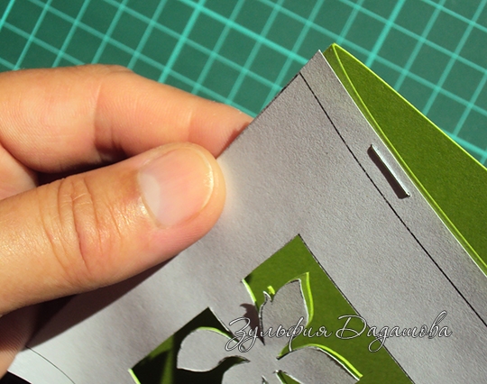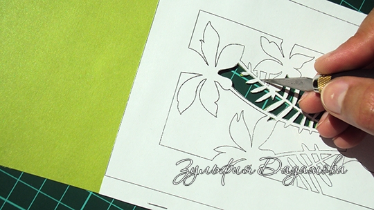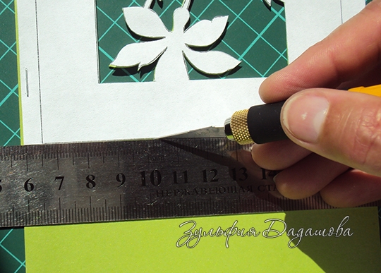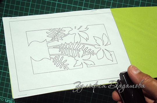 Распечатайте шаблон и обрежьте, оставив с трех сторон поля по 1 см, четвертую сторону обрежьте по пунктирной линии (по линии сгиба). Степлером прикрепите схему к плотной бумаге или картону салатового цвета. Сверху нужно оставить достаточно места для вырезания задней стороны открытки.
