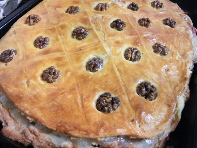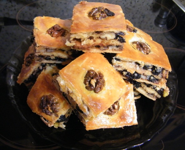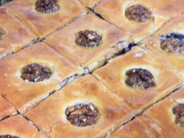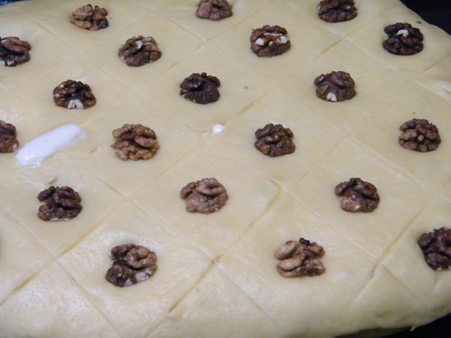 Немного примять (уплотнить), сделать неглубокие надрезы (стараясь не прорезать!), украсить половинками ореха и смазать всю пахлаву желтком.