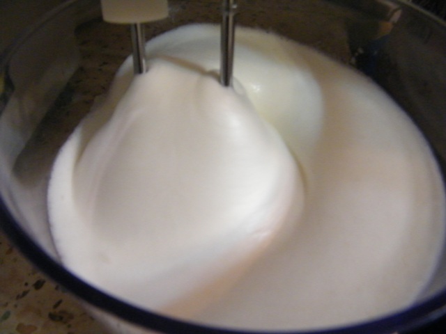 Пока выпекается корж сделаем начинку: 6 белков из холодильника взбить с 2 стаканами сахара до пышного состояния.