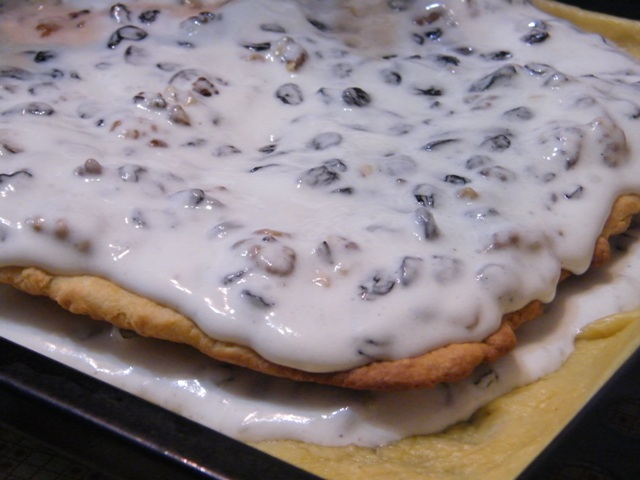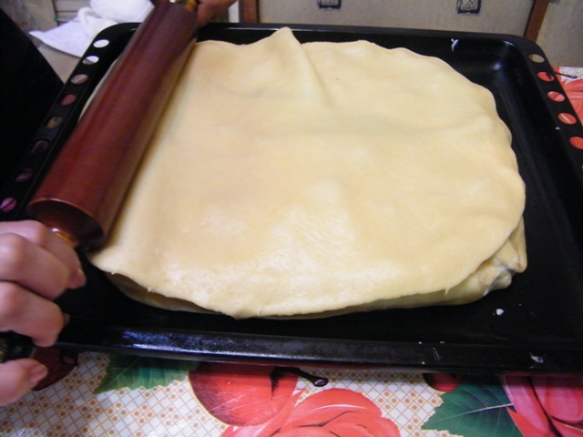 Раскатать тонко большую часть теста (края для бортика), выложить половину начинки на пласт.