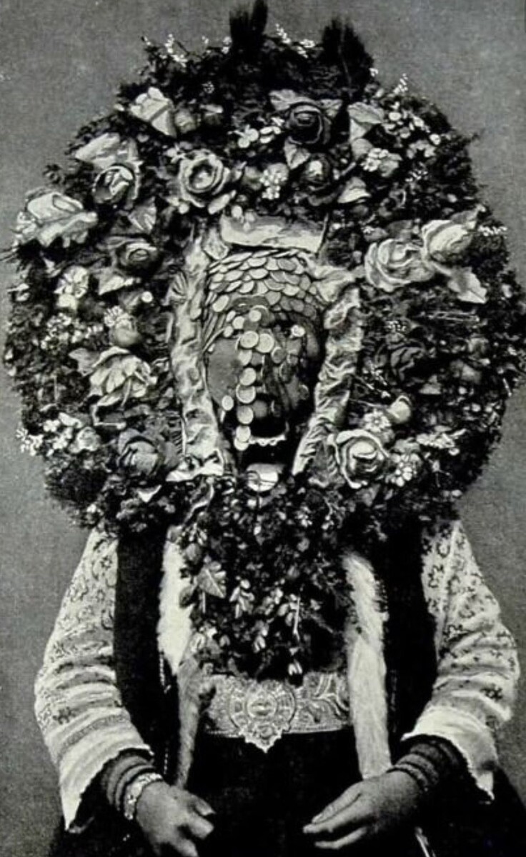 В некоторых частях Софийского региона невеста носила огромный нимб из цветов и пучков ковыля, а ее лицо скрывала занавеска из многочисленных тонких косичек, увешанных монетами.
