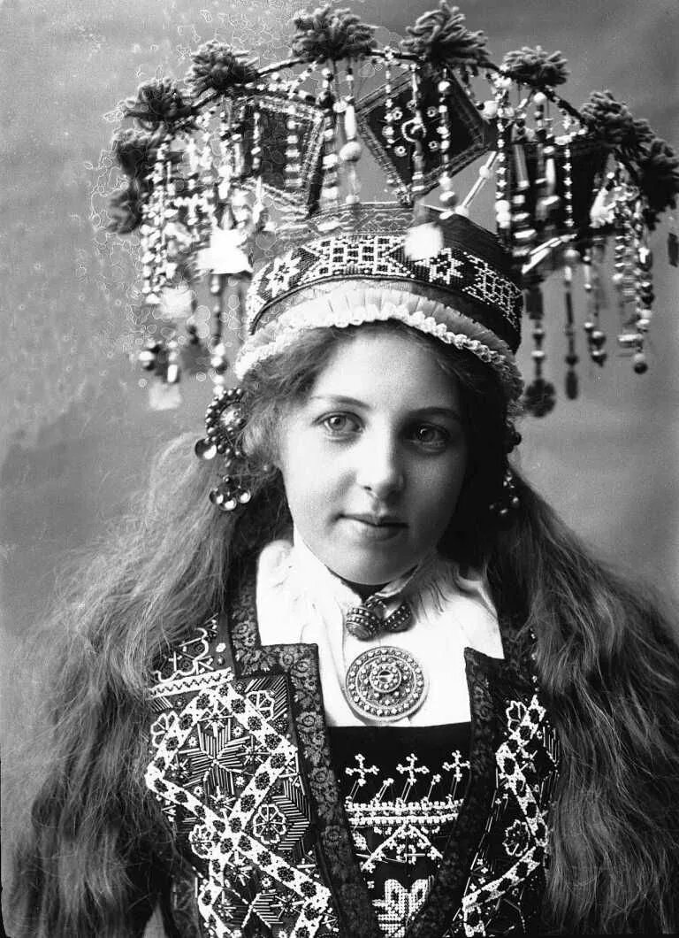 Далее переместимся в Норвегию. На фото из собрания Norsk Folkemuseum, сделанных в период 1897-1920 гг, совсем юные "невесты" из Осло с невероятными головными уборами.